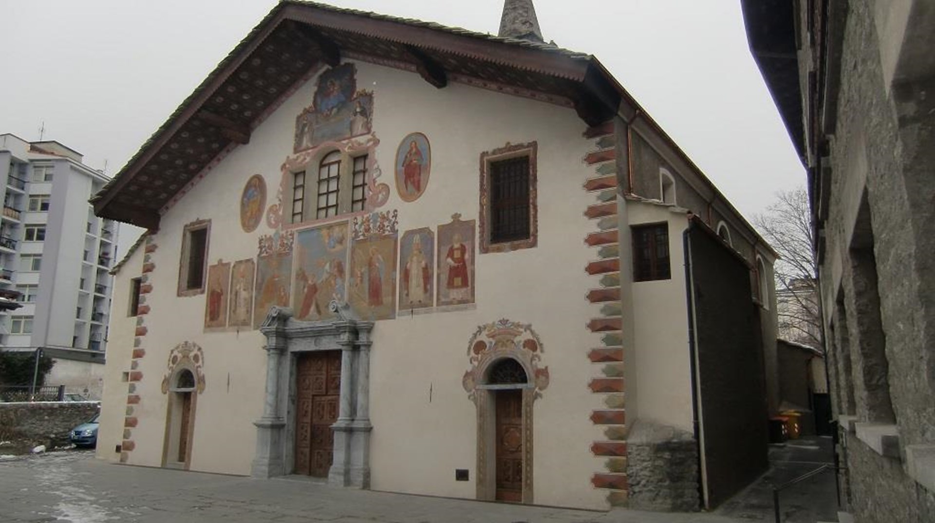 The current building was built on the walled structures of a previous church from the 15th century, to which an inscription on the architrave of the right hand entrance door refers: “Hoc opus fecit fieri Jaquemin Pastor” (Jaquemin Pastor had this building built). The church was restored extensively in 1728-29, as appears from the agreement stipulated on 25 April 1728 by the parish priest Clérin, who also had the bell tower raised. The frescoes on the facade were, on the other hand, painted by his successor Michel-Joseph Rosaire, the parish priest between 1729 and 1735.