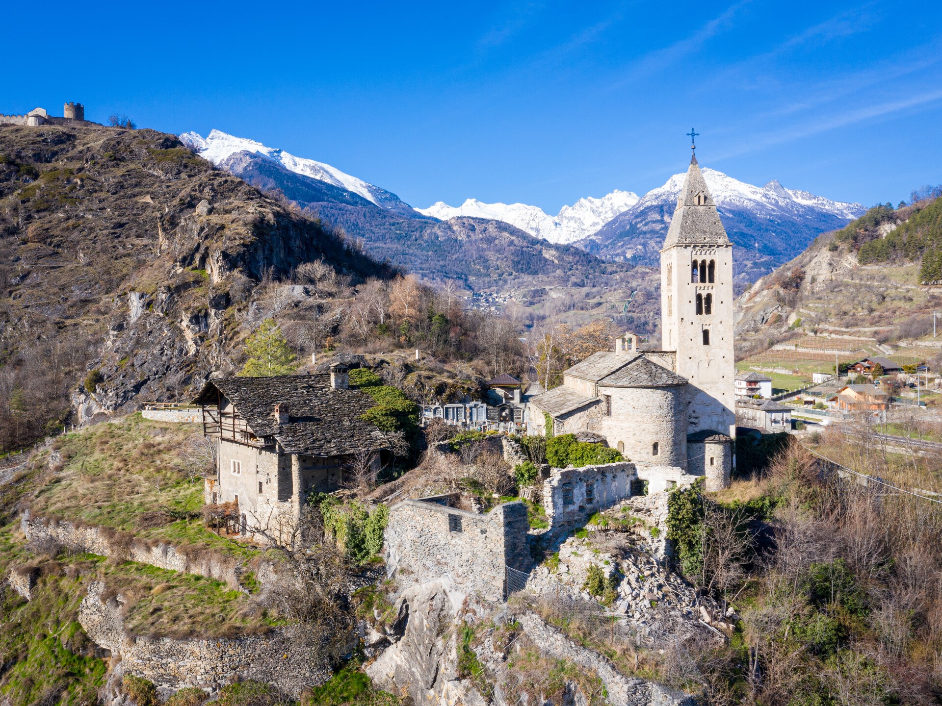 You can access the church on foot, within the space of five minutes, from the road that unwinds from the bridge over the Dora Baltea.