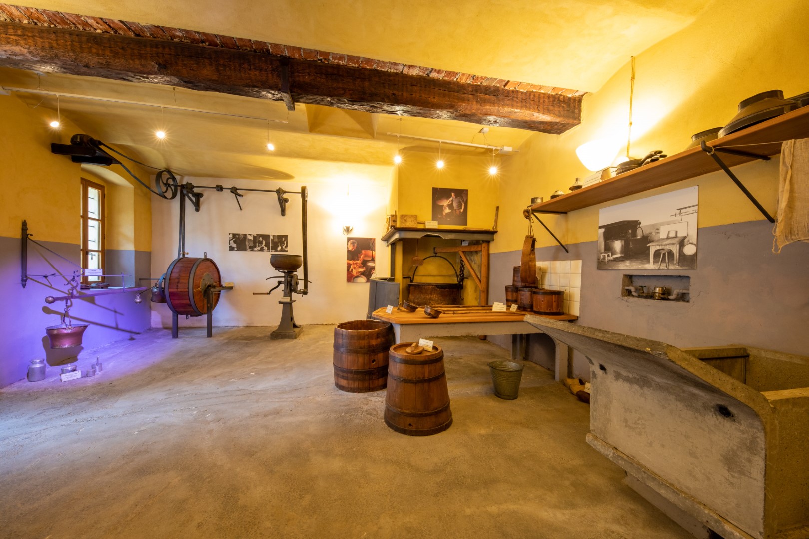 While the premises used up to thirty years ago as a social dairy preserve nowadays the furnishings and equipment for the delivery of milk and the subsequent dairy processing, as well as the documentation and records relating to the operation of the company itself, in the adjoining room, entirely frescoed , the evidence of the activity of the “Confrèrie du Saint-Esprit” emerges, existing since 1012 as reported on the fresco depicting the Last Supper.