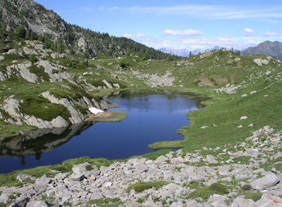 Geology: glacier origin morphology is prevalent, especially the series of terraced rock basins which currently host small lake and marsh basins. Modest remains of the ancient glacier that occupied the valley until 10,000 years ago are found in the snowfield in the small circle at the foot of the North face of Mont Mars. The dominating rocks are mica schist with white marble stripes and dark basic rocks.