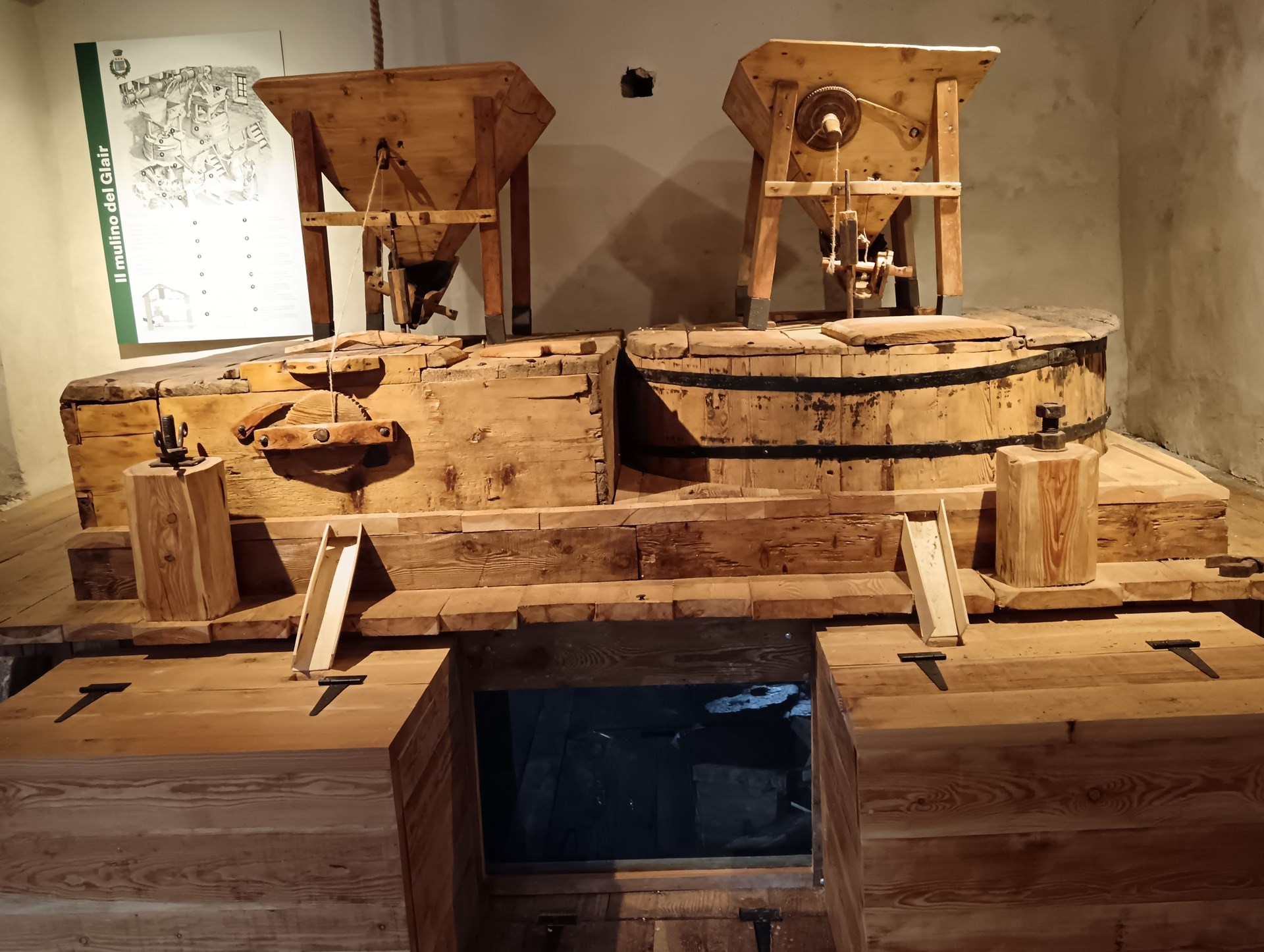 Con dos antiguas muelas de piedra, el molino era esecial para moler centeno y maíz, cultivados en las terrazas que se encuentran cuesta arriba del pueblo. Su historia se encuentra ya en unos documentos del inicio del 1400, mientras que el nombre “Glair” (de “glairs”, o sea las graveras dejadas por los ríos después de las inundaciones) trae a la memoria su pasado de tierra aluvional, caracterizada por siglos de inundaciones, como la devastante del 1655.