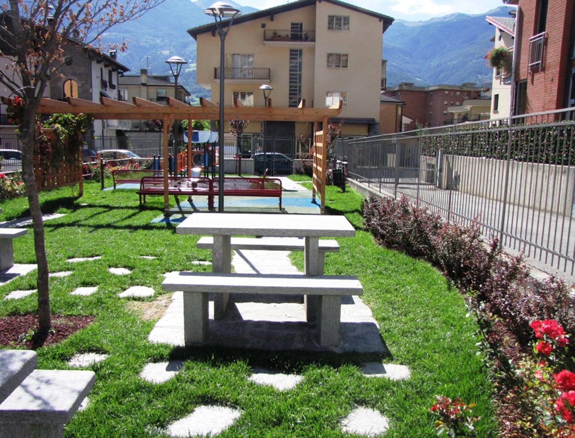 Zona verde transitable en via Saint Martin de Corléans con estructuras multijuego (3-5 anos), bancos y mesas y parque infantil.