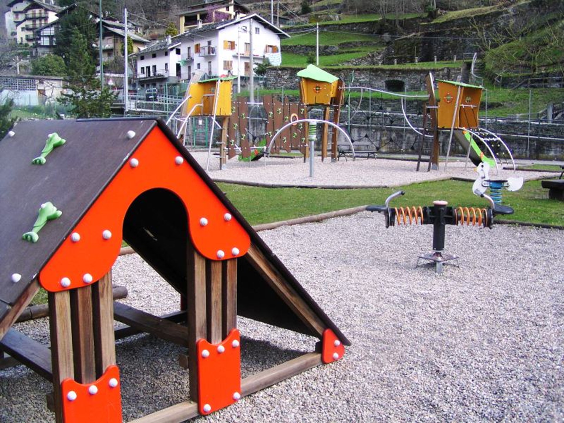 L’area da gioco ha una superficie di 900 mq. ed è dotata di strutture gioco, scivoli, altalene, giochi a molla, varie panchine.