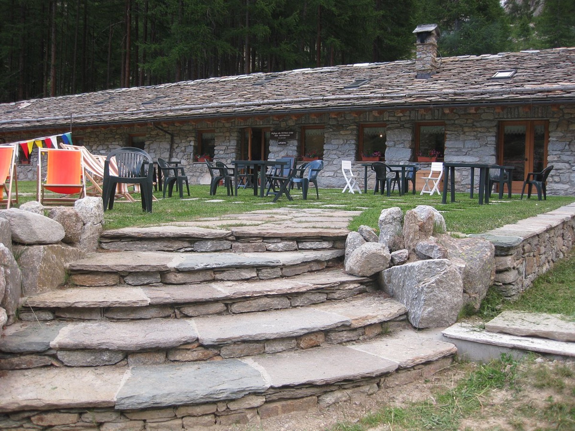En un vasto claro lujuriante en un bosque de alerces hay una larga refugio en piedra, que una vez era un establo. Actualmente ha sido restaurada y transformada en un acogedor refugio de montaña que acoge alpinistas, senderistas o curiosos que quieren almorzar o cenar en compañía. La cocina ofrece platos típicos del Valle de Aosta e internacionales.