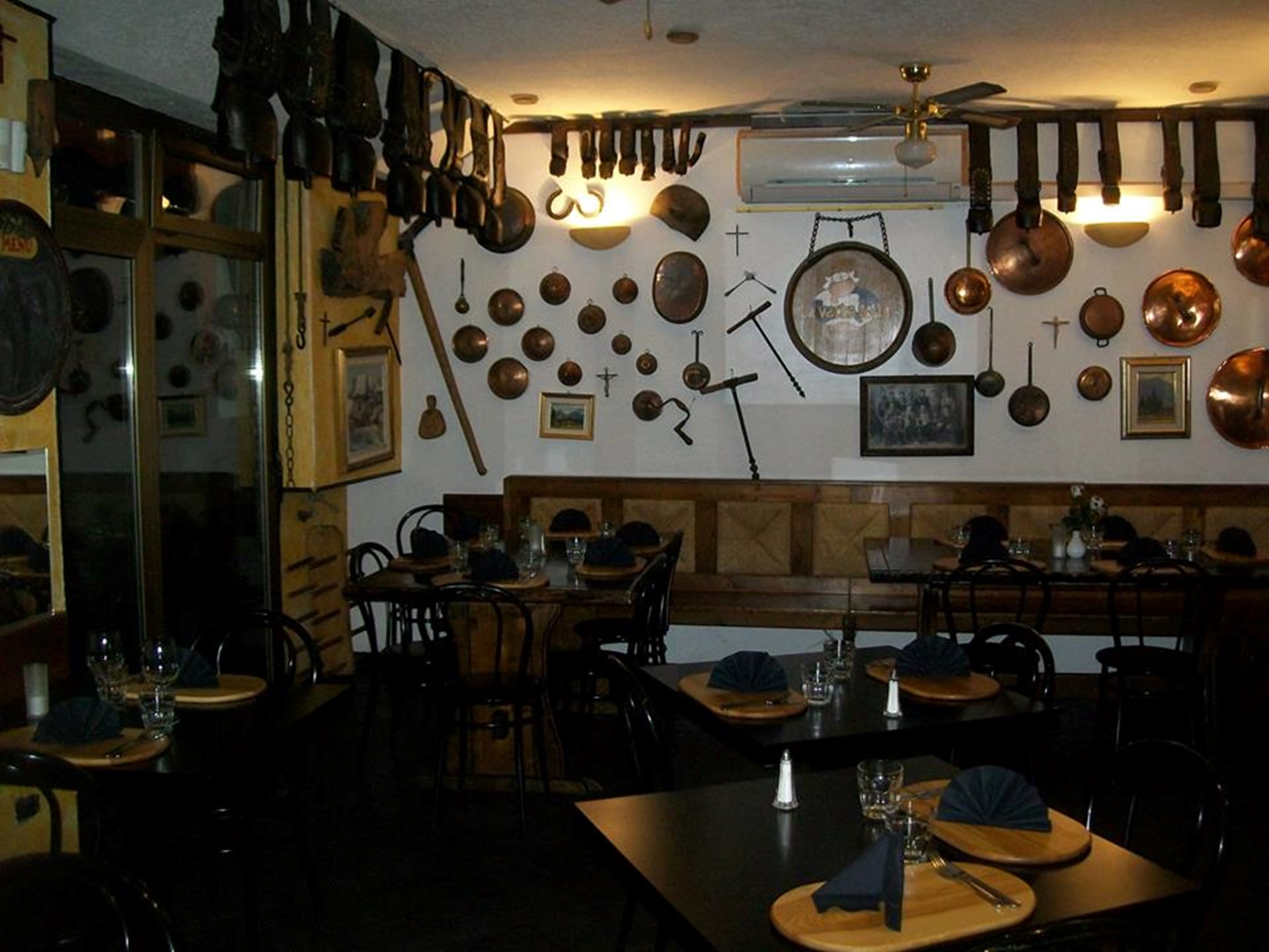 La Osteria "La Vache Folle" ofrece cocina típica del Valle de Aosta en un restaurante rústico decorado con objetos tradicionales campesinos.
