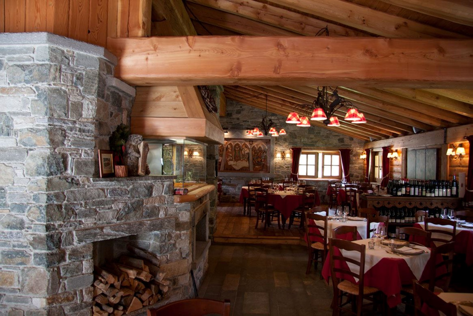 Sala típica alpina en madera y piedra con chimenea, ubicada en Champoluc, buena cocina con especialidades locales. Ambiente acogedor y familiar.