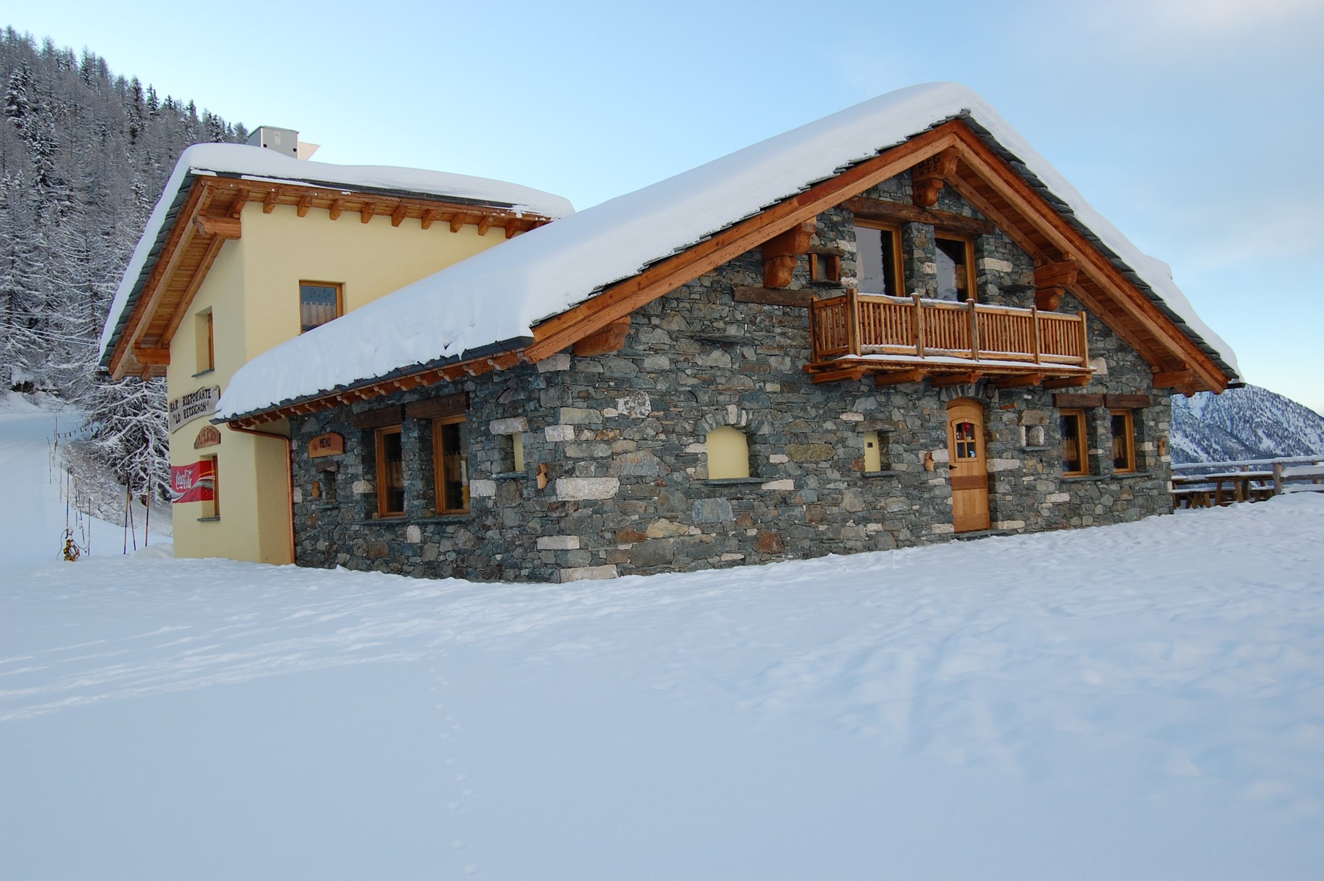 El Retsignon está estructurado en dos plantas con dos dehors: una frontal muy grande y una lateral más pequeña, pero con una excelente vista panorámica. La cocina ofrece especialidades que forman parte de la cultura gastronómica de montaña como, por ejemplo, la polenta concia y la sopa Valle d’Aosta, hasta las más clásicas como la pasta, las hamburguesas, las patatas fritas y ensaladas variadas, todo para disfrutar en un ambiente acogedor y amigable.