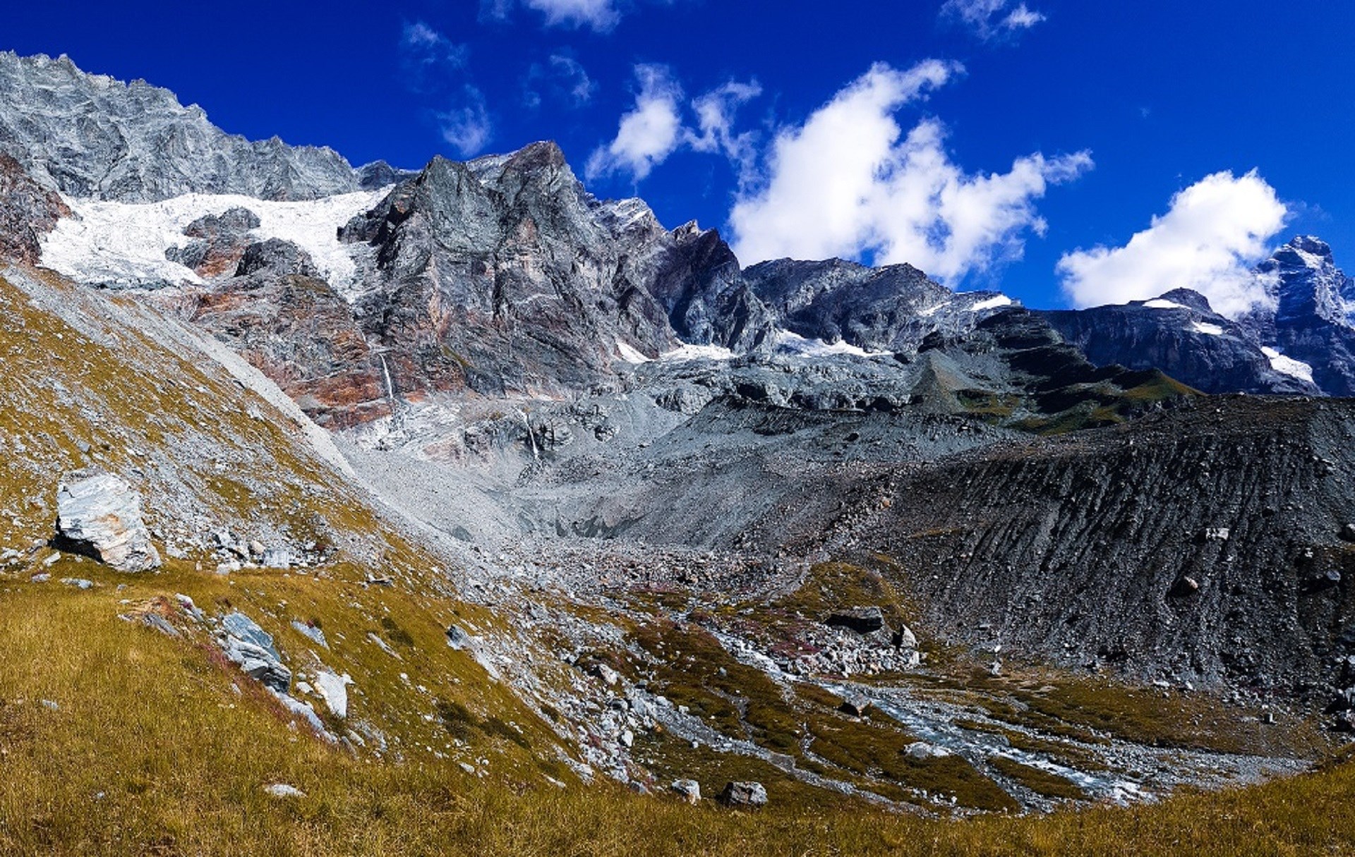 The return takes place by descending the Matterhorn moraine and reaching the pastures of Plan Maison.