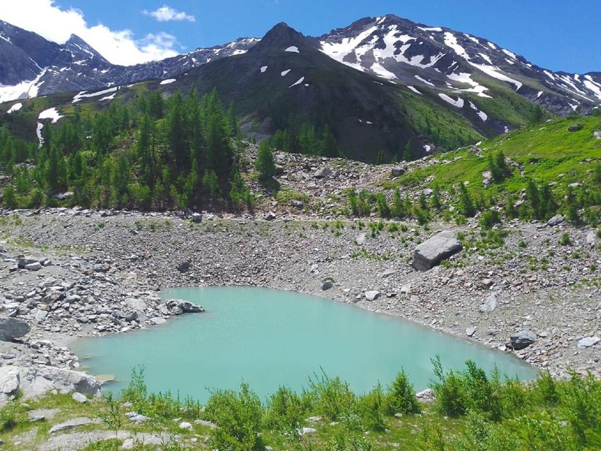 Lake Miage, is a place of great narural interest at the foot of Mont Blanc. From up here you can see how frightfully and magnificently imposing was the river of ice that once, not too remote to us, descended in the direction of Courmayeur. Caressing its banks, we can feel the voice of the glacier, with its creaks and the fall of some of its blocks covered by debris inside the mirror of water: small icebergs that testify to the consequences of climate change.