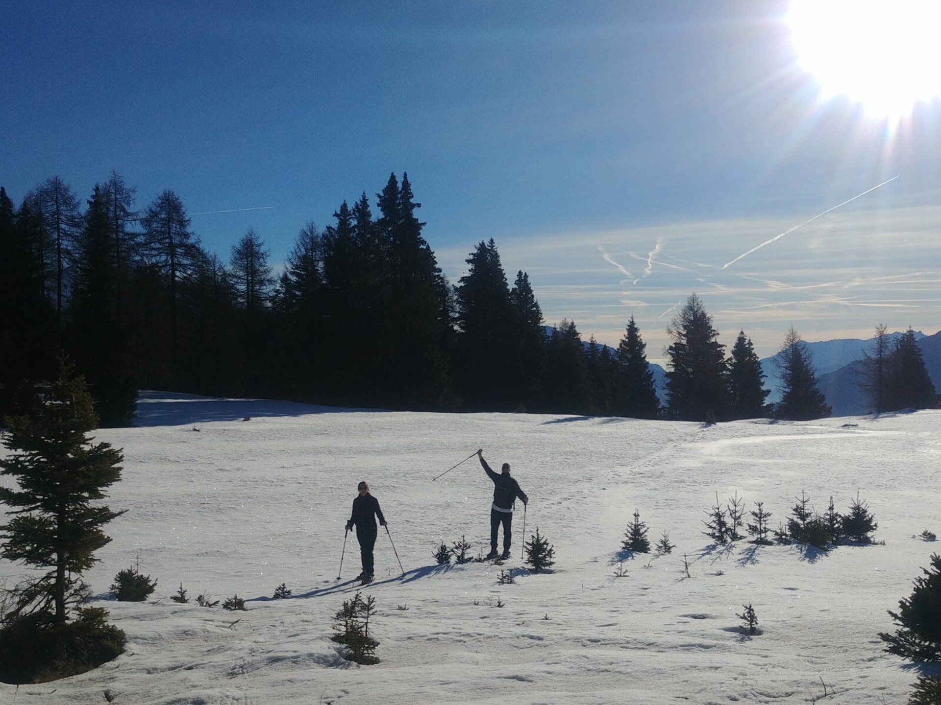 Beautiful snowshoes tour in a spectacular winter scenery through snow-covered meadows and coniferous forests above the village of Torgnon, le pays du soleil! Breath-taking view of the Valtournenche mountains, the central valley and Piemonte.