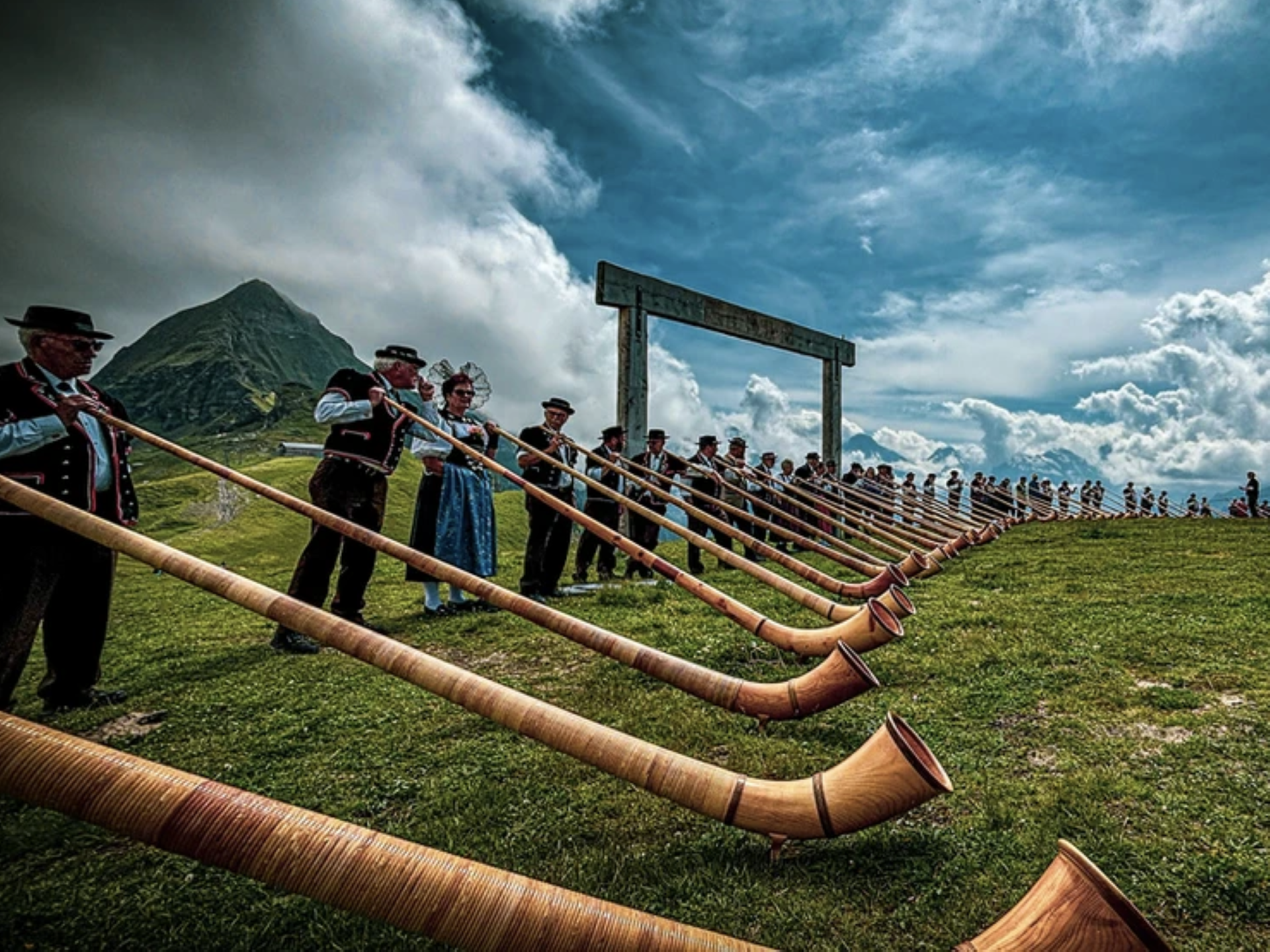 The day is accompanied by the notes of six horns of Alps of the Groupe Cor des Alpes Echo vom Stockhorn: an instrument of very ancient origin, made of wood in a conical section, with a cup-shaped mouthpiece, used by the inhabitants of the Alps.