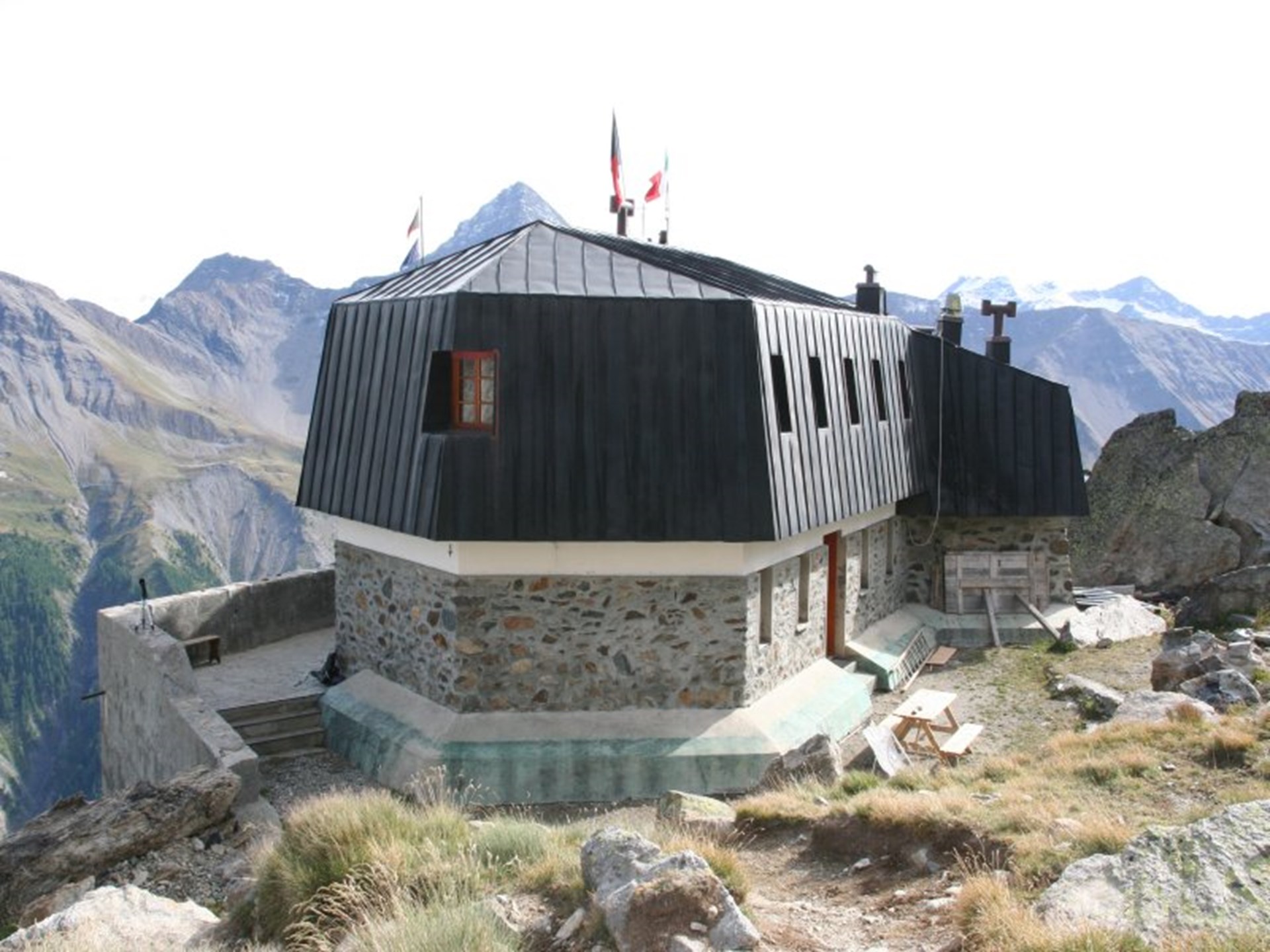 El refugio consiste en una cómoda construcción de ladrillo con una posición estratégica y privilegiada en el Mont Blanc, perfectamente visible incluso desde el fondo del Val Veny. Sustituyó, en 1965, a la antigua cabaña o Refugio Gamba, en conmemoración del joven alpinista milanés Franco Monzino.