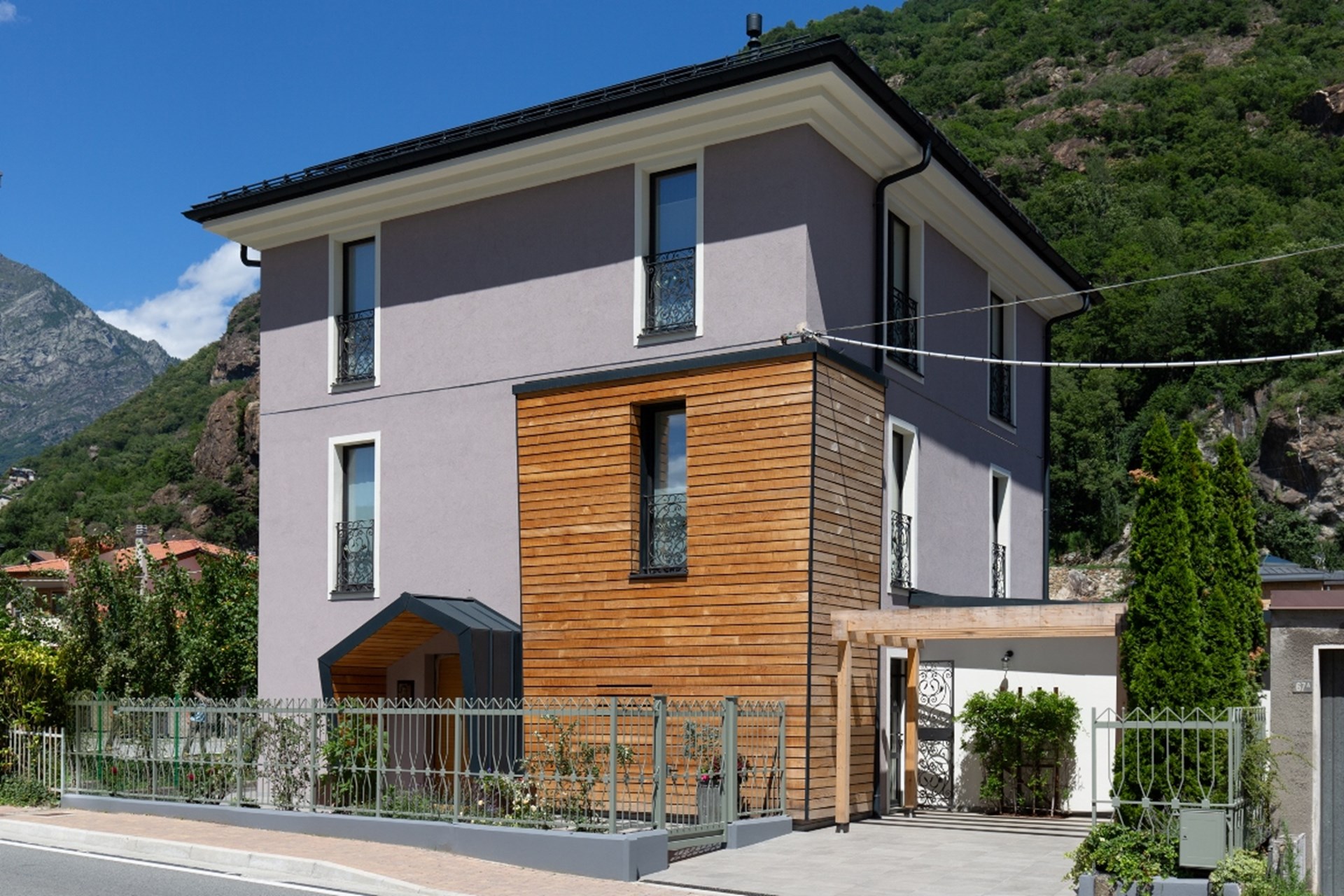 L’edificio in pietra risalente all’anno 1948 è stato riconfigurato con un attento restauro dai proprietari e gestori, gli architetti Silvia e Gabriele Grosso. I lavori hanno previsto l’uso del legno in tutti i suoi infiniti usi e varianti: castagno, cedro, cirmolo, rovere, noce, ciliegio, abete e incenso sono le essenze che accompagnano i nostri ospiti nelle stanze con il loro profumo aromatico. Le stanze sono dedicate a pittori e scultori valdostani, italiani e stranieri, e tutta la struttura ospita opere d’arte di proprietà dei gestori, ammirabili sia nelle camere che nelle zone comuni.