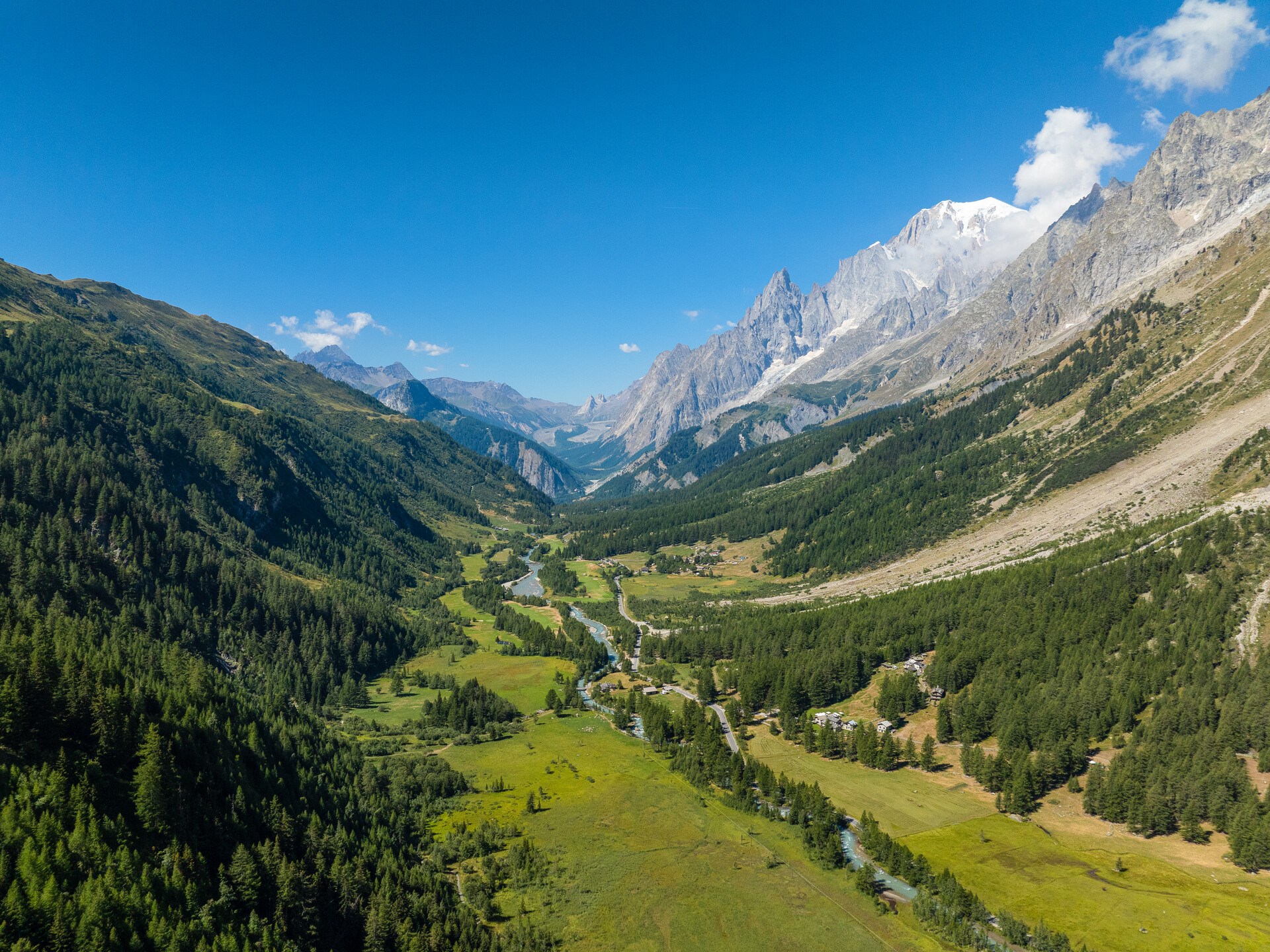 Los dos valles laterales son unos paraísos naturales y contienen varios paisajes, que varían a lo largo de las estaciones. En verano, por ejemplo, el Valle de Veny ofrece unos ambientes, heterogéneos, desde Entrèves hasta el Col de La Seigne, a la frontera con la Saboya (Francia). Como la zona costea el glaciar de la Brenva, al inicio el valle es estrecho, salvaje y escabroso, pero después se transforma en una vasta cuenca llana. En el frente del glaciar se ha formado un pequeño lago, el lago del Miage, encerrado en su morrena. Desde el espejo de agua se pueden ver los movimientos del glaciar que, de vez en cuando, deja caer unos bloques en el agua, formando así unos pequeños icebergs. El valle gemelo también, el Valle de Ferret, permite hacer unas experiencias inolvidables, como por ejemplo pasear o practicar esquí de fondo delante de las maravillosas Grandes Jorasses.