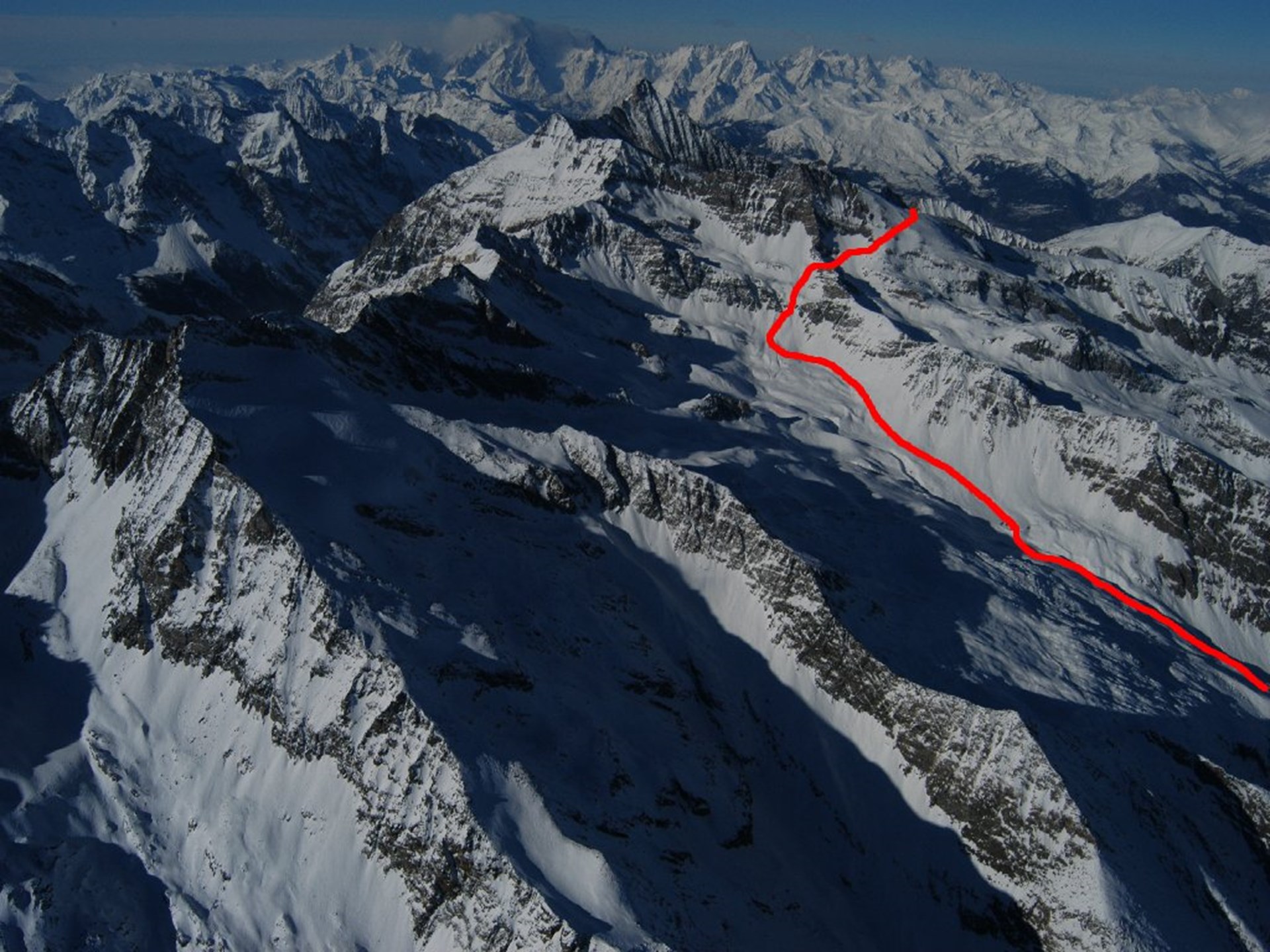 Desde el refugio, continuar por el fondo del cañón hacia el Col Lauson; a unos 2950 m de altitud, girar a la derecha y subir por las pendientes más escarpadas que llegan al Glaciar de la Rousse. Al llevar al valle que está por encima, continuar por escarpadas pendientes a la derecha y llegar al Colle della Rossa (3195 m). Desde el paso, con una larga y escarpada diagonal en dirección norte, subir a la cresta nordeste de la Punta Rossa. Seguir la cresta para llegar a la cima.