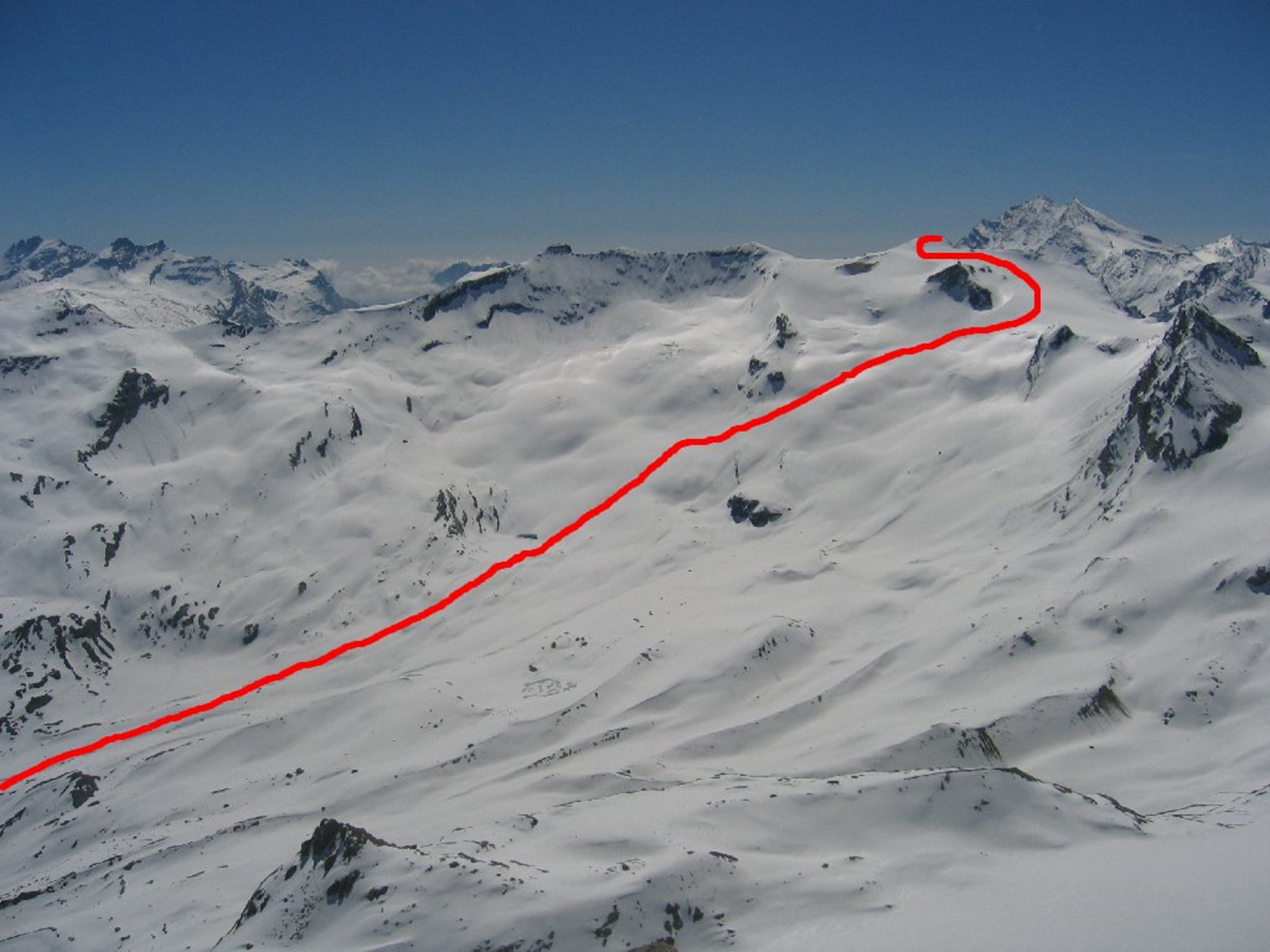 Bordear el Dora por la izquierda y dejar atrás una larga meseta manteniéndose lo más abajo posible. Al final, comenzar a subir ligeramente por la izquierda en dirección al glaciar de Fond, dejando a la izquierda un bien visible bloque cuadrado. Bordear por la base las rocas que separan los glaciares de Lavassey y de Fond para después continuar en dirección al Colle Basagne. Prestar atención a las numerosas y peligrosas brechas. Al llegar al paso, girar a la izquierda y remontar una amplia pendiente dejando las rocas a la izquierda. Dirigirse hacia la escarpada pendiente que lleva a la cima y que se puede doblar hacia la izquierda. En la cima hay una gran señal que se puede ver de lejos.