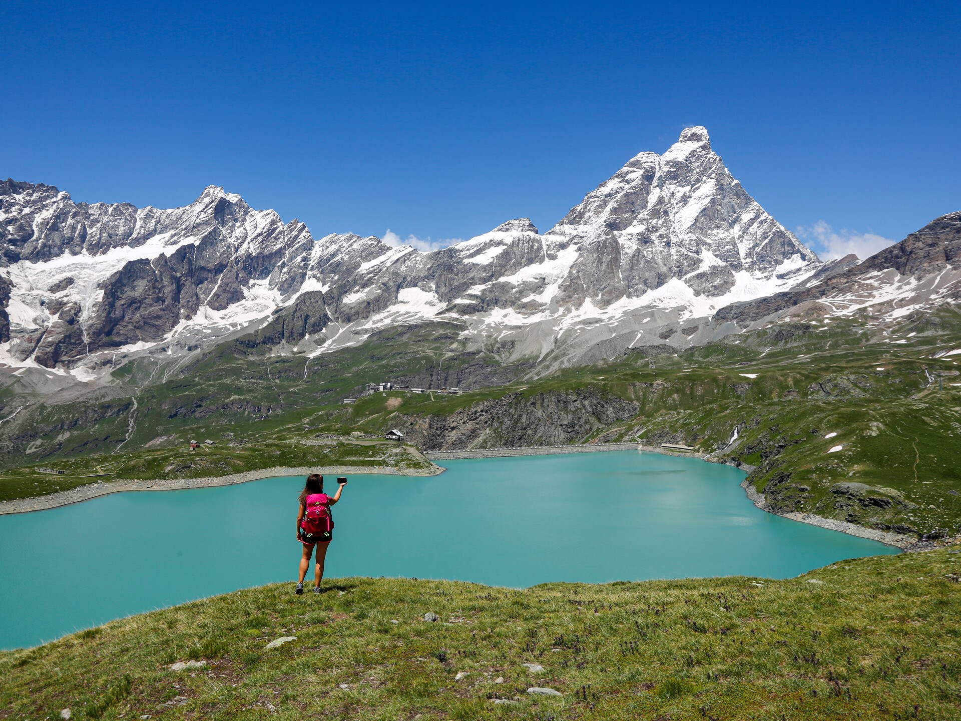 No ha perdido su encanto la montaña que millones de personas conocen por haberla bajado esquiando. Vale la pena subir a pie, cruzando los prados de la larga cuesta que termina en el lago Goillet, luego las rañas donde cada verano se renueva el milagro de la vida, con flores vistosas y perfumes finos y penetrantes. El Cervino y las Grandes Murailles enmarcan el paisaje majestuosamente. El paso es un amplio espacio independiente, suspendido en las alturas y encerrado por las Cime Bianche como si fueran un cándido telón. En frente, los lagos se escalonan hasta la base del glaciar del Rosa, con fuertes tonos celestes cada vez más cargados a medida que el agua desciende y se purifica del limo glacial.