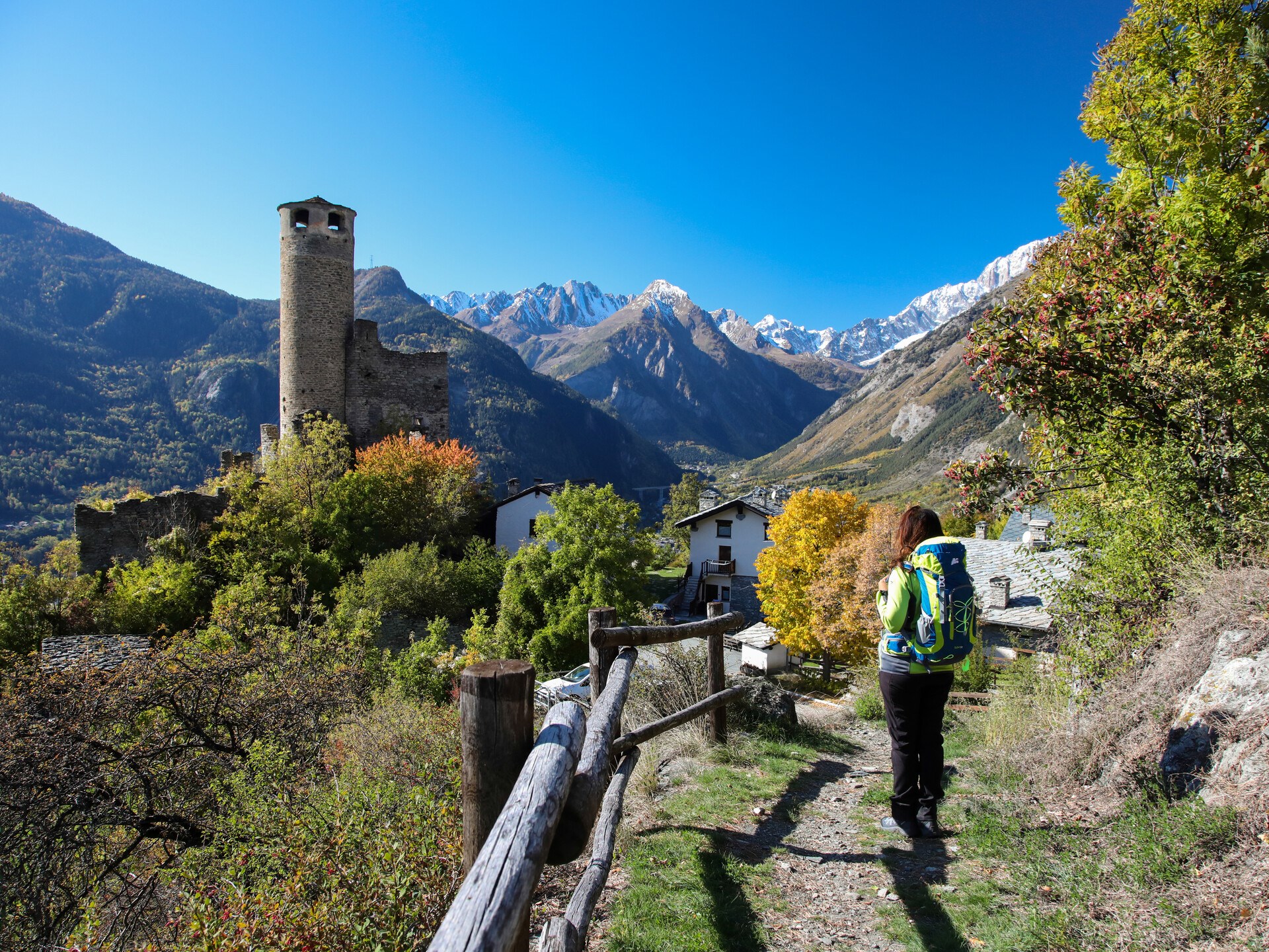En el primer cruce, tomaremos a la derecha el sendero indicado por la señal amarilla número 5A en dirección al Château de Chatelard. Pasaremos entre terrazas que ahora albergan huertos y viñedos. Los viñedos de Morgex y La Salle se encuentran entre los más altos de Europa. El tipo de uva que se cultiva es el Prié Blanc que se denomina “franco de pie” porque, gracias a la altitud a la que puede vivir, a finales del siglo XIX no tuvieron que ser injertados en viñas americanas tras la plaga de la filoxera. Este tipo de uva se utiliza en la elaboración del vino DOC Blanc de Morgex et de La Salle.