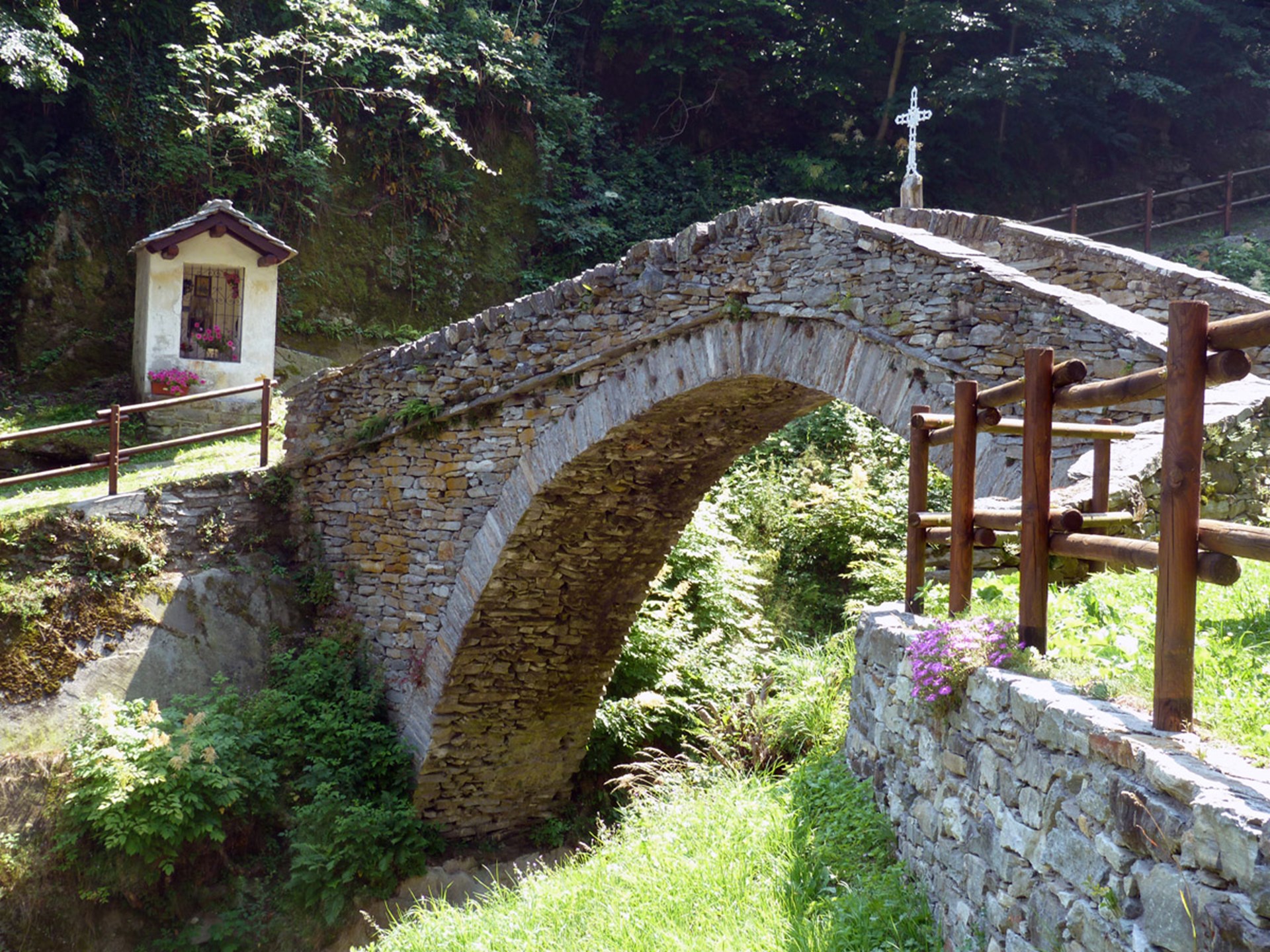 El sendero supera el torrente Brenve por un puente de madera y, tras pocas decenas de metros, empieza la empinada escalinata de piedra que lleva por el medio del bosque y llega al santuario de Retempio.