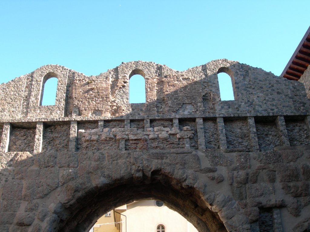 Contaba con tres aperturas todavía visibles hoy en día: la central para los carros y las laterales para los peatones. El área delimitada por las aperturas se utilizaba como patio de armas; en la parte meridional, el terreno fue excavado hasta el nivel del suelo en época romana (unos dos metros por debajo del nivel actual; la diferencia se debe a los materiales trasladados por las crecidas de los ríos). En las aperturas que dan al exterior todavía se pueden ver las ranuras por las cuales pasaban las rejas que, por la noche, se bajaban.