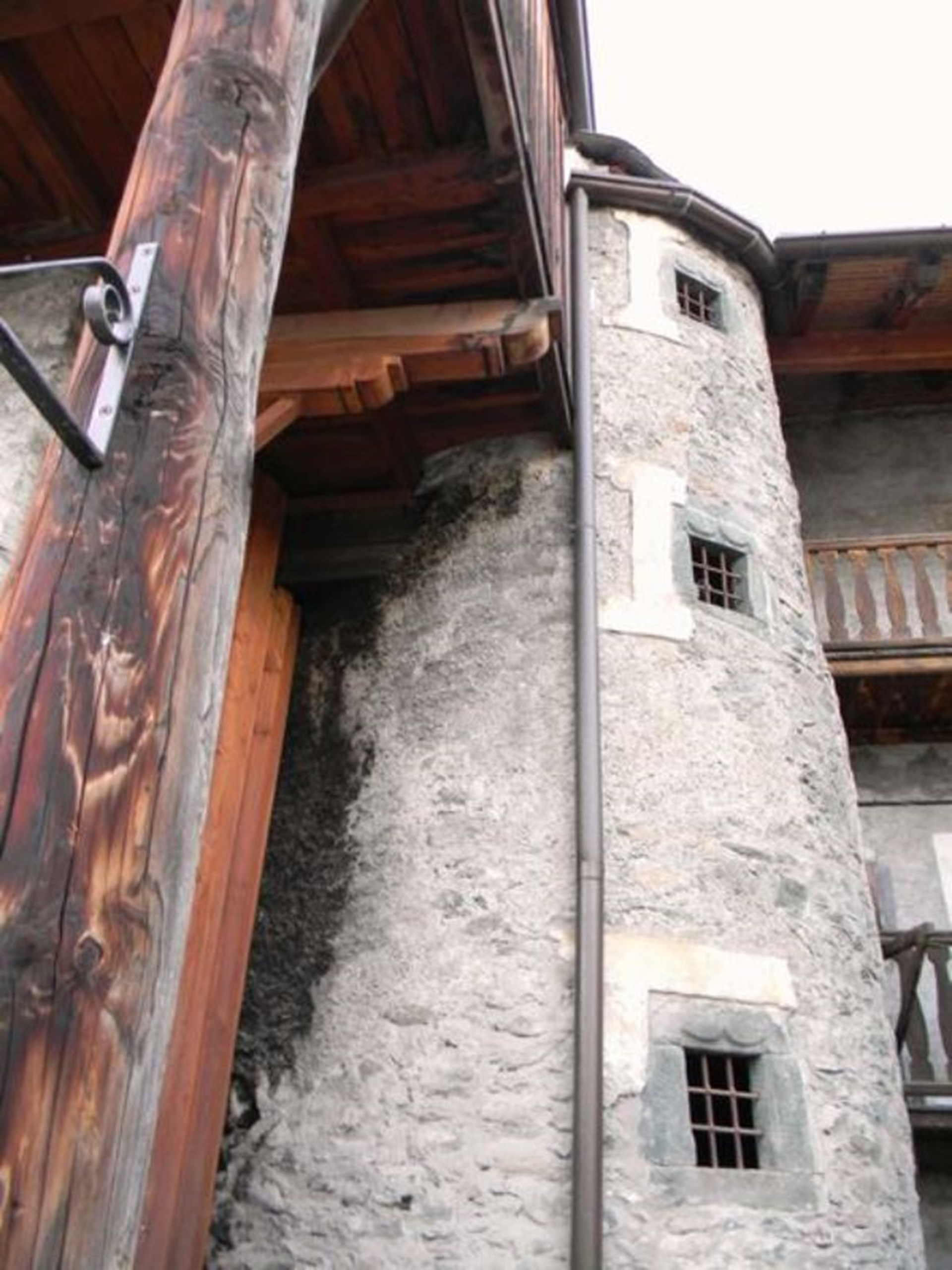El edificio, que conserva en el lado de la carretera un hermoso balcón de madera sostenido por saetones, tiene a su lado una torre cilíndrica con escalera interior, con tres ventanas superpuestas decoradas con el motivo de quilla al revés. A mediados del siglo XV, vivía aquí el castellano de los Challant. Una curiosidad: la zarpa fijada al balcón, según se dice, es la del último ejemplar de oso abatido en el valle durante el siglo pasado.