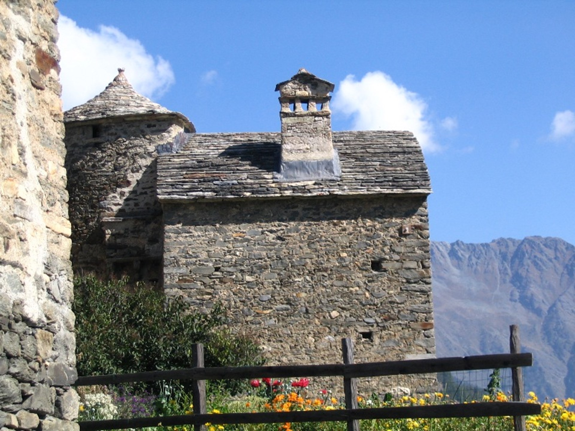 Situada encima de Saint Léonard, en la pedanía de Chez-Vuillen, la construcción se caracteriza por una torre cilíndrica con escalera de caracol en piedra tallata.