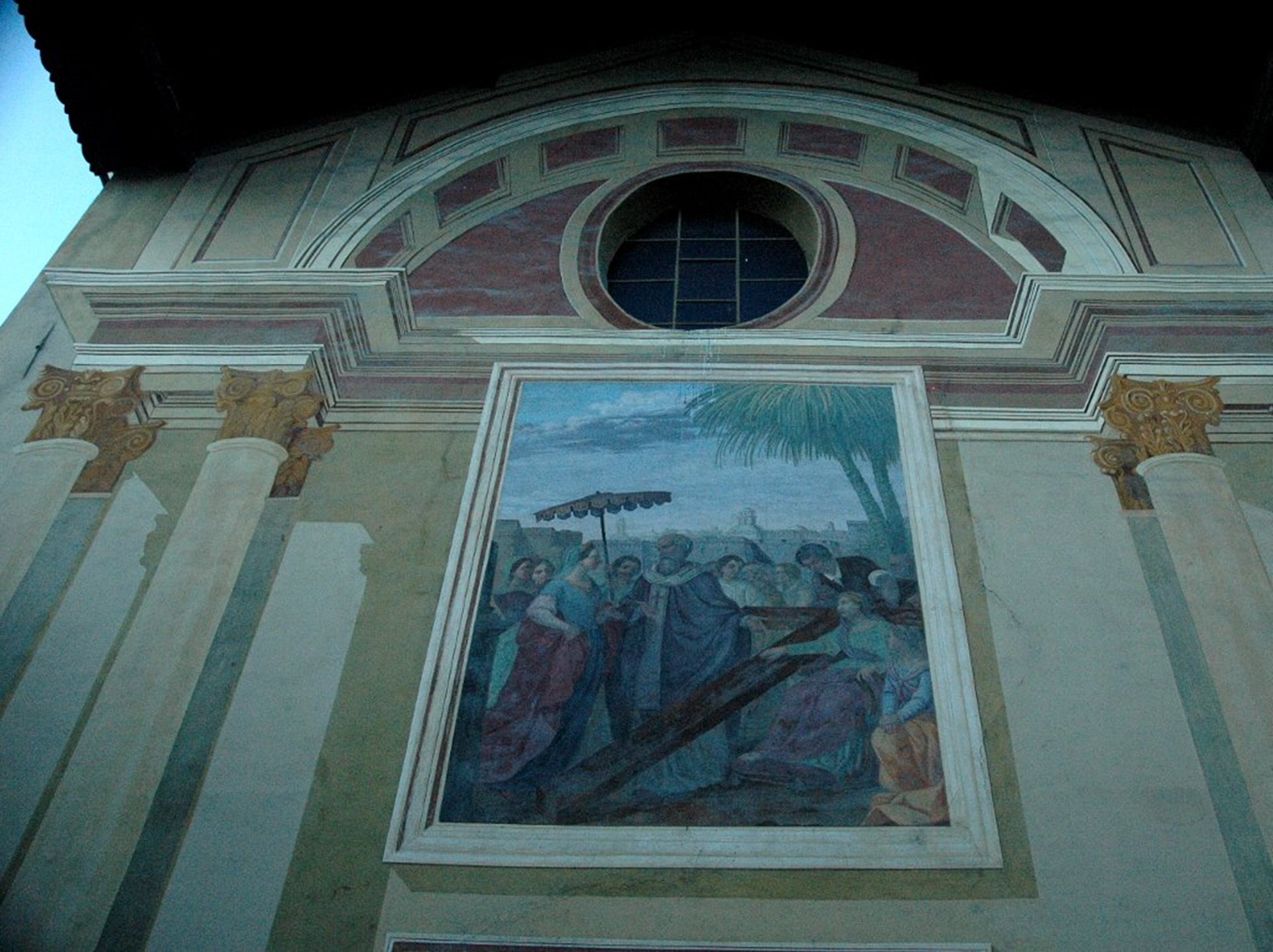La decoración del siglo XIX con una fachada trampantojo pretende una arquitectura que incluye una pintura del Descubrimiento de la Santa Cruz por Santa Elena, madre del emperador Constantino.