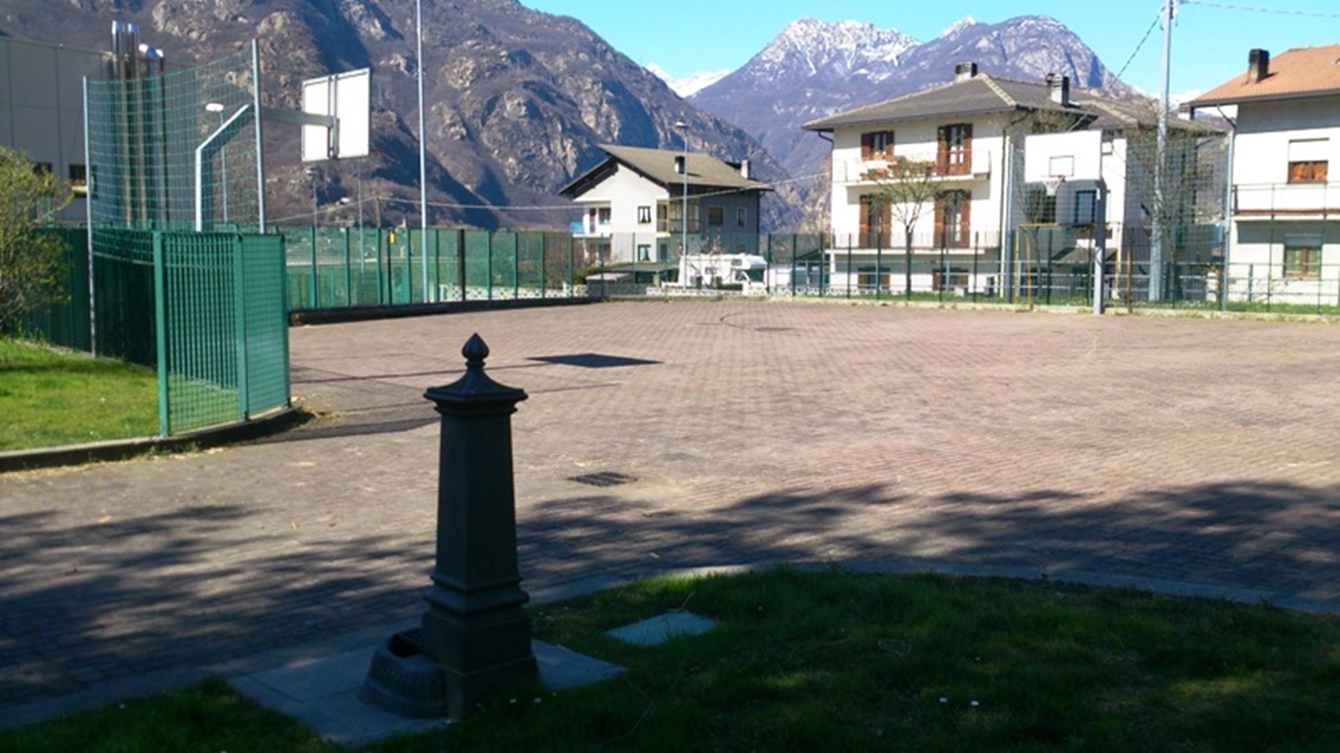 Area gioco: 1 altalena, n. 1 scivolo, n. 1 campo da basket, n. 5 panchine.