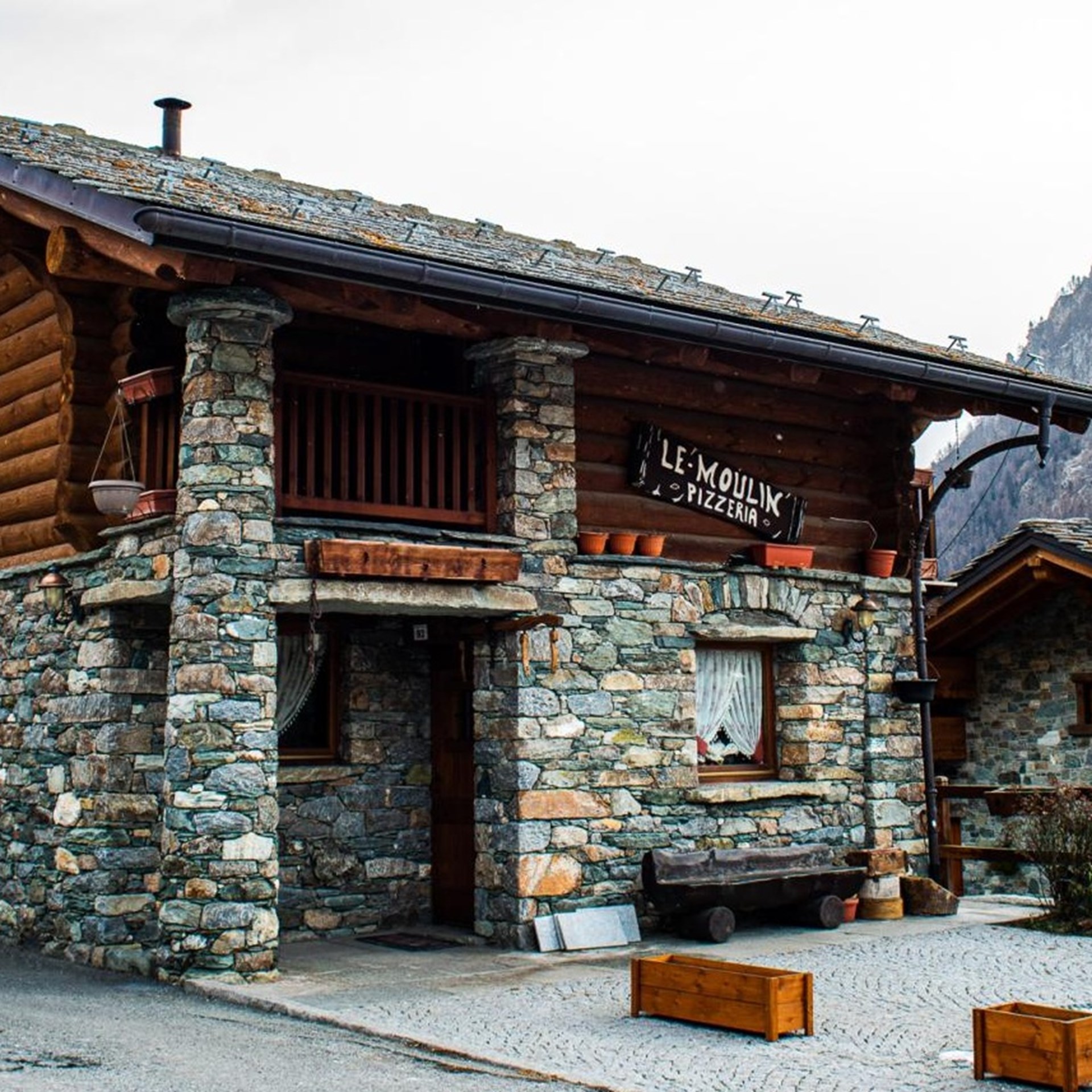 Pizzeria avec une ambiance conviviale, de type typique de montagne de pierre et de bois et une cheminée.
