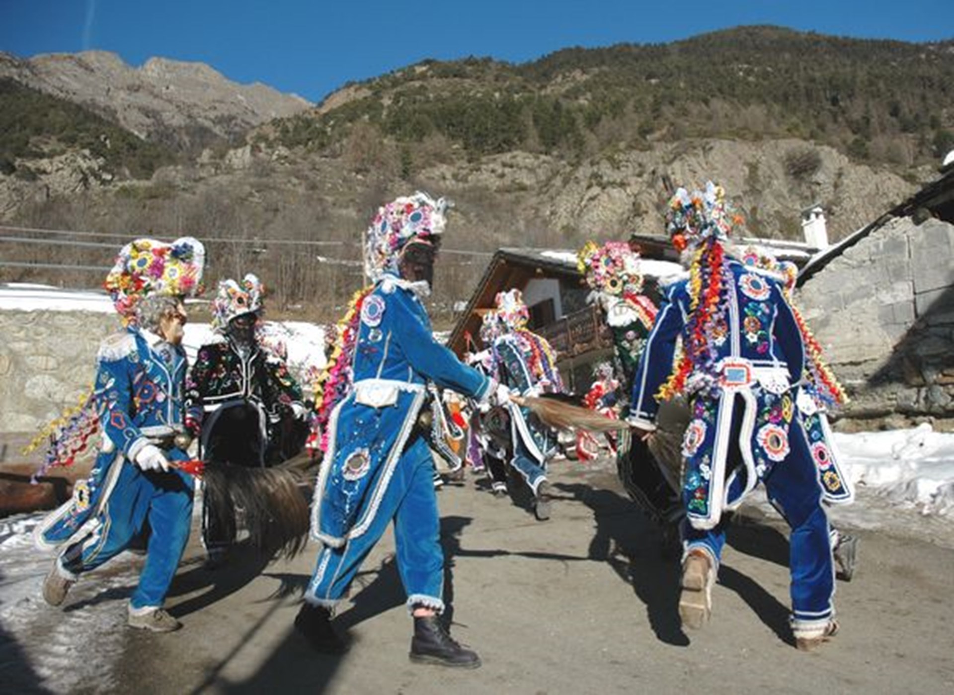 Nous y retrouvons aussi l’ours qui représente la succession des saisons ; les queues des mulets, qui représentent les vents et servent à éloigner les courants d’air néfastes ; les miroirs sur les costumes, qui doivent chasser les esprits malins ; la couleur rouge qui symbolise la force et la vigueur et qui, elle aussi détient le pouvoir d’exorciser les maléfices et les disgrâces. Lors du cortège, les personnages déguisés font une visite aux familles ; ils entrent dans les maisons, ils dansent dans les rues et sur les places, ils mangent et ils boivent ce qu’on leur offre.