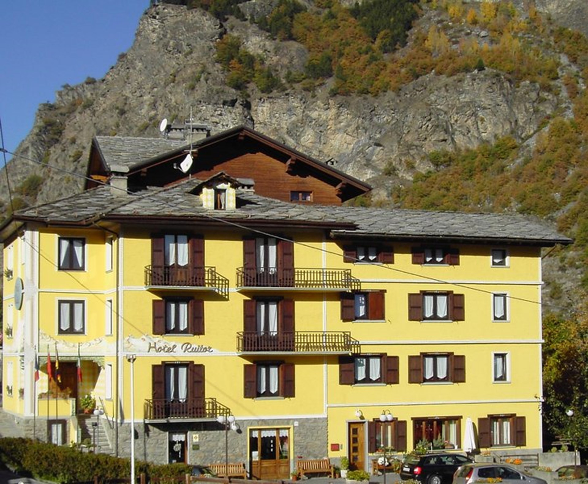 Au c?ur de la Haute Vallée d'Aoste, près du Parc National du Grand Paradis, l'hôtel Ruitor vous accueille avec sa belle façade décorée.
