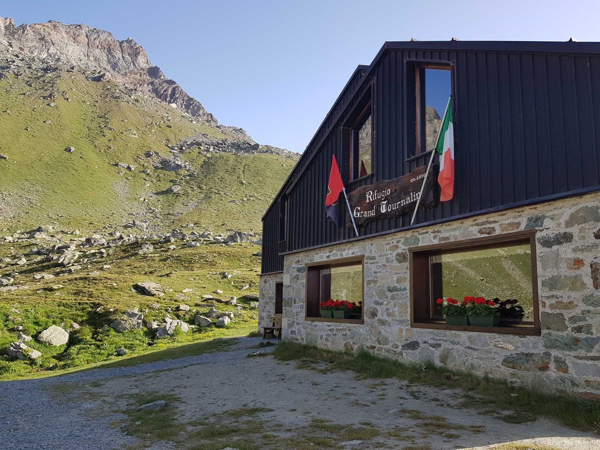 Construit en 1994, le refuge Grand Tournalin est un bâtiment caractéristique de trois étages en cuivre et en pierre, parfaitement intégré dans le paysage alpin.