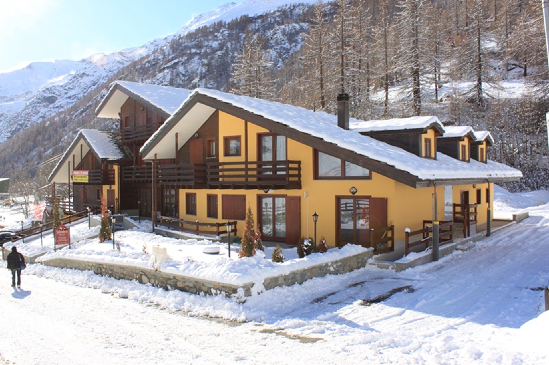 Les pistes de ski se terminent précisément là où commence la résidence-hôtel dont la terrasse de certains appartements confine même avec la fin des pistes du versant Bettaforca-Champoluc. Les personnes qui souhaitent skier sur le versant opposé, le Salati-Alagna, n’ont qu’à traverser la route pour rejoindre l’établissement.