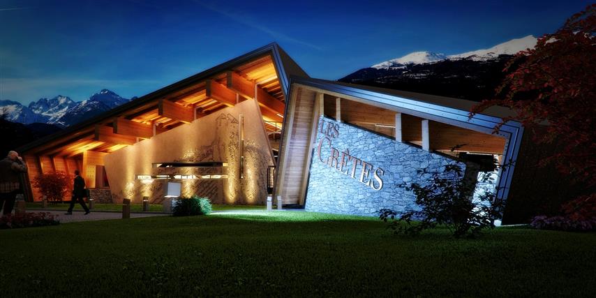 « Refuge du vin » parce que l’établissement s’élève au cœur des Alpes, avec une architecture typique d’altitude, et parce qu’il s’agit d’une construction conçue pour la protection du vin en tant que patrimoine authentique du terroir montagnard. Sa silhouette rappelle un massif de montage, devenant le symbole de « Les Crêtes » et caractérisant ainsi la marque. Cette grande cour couverte abrite les lieux de production et la boutique du vin, unis dans un intéressant parcours de visite.