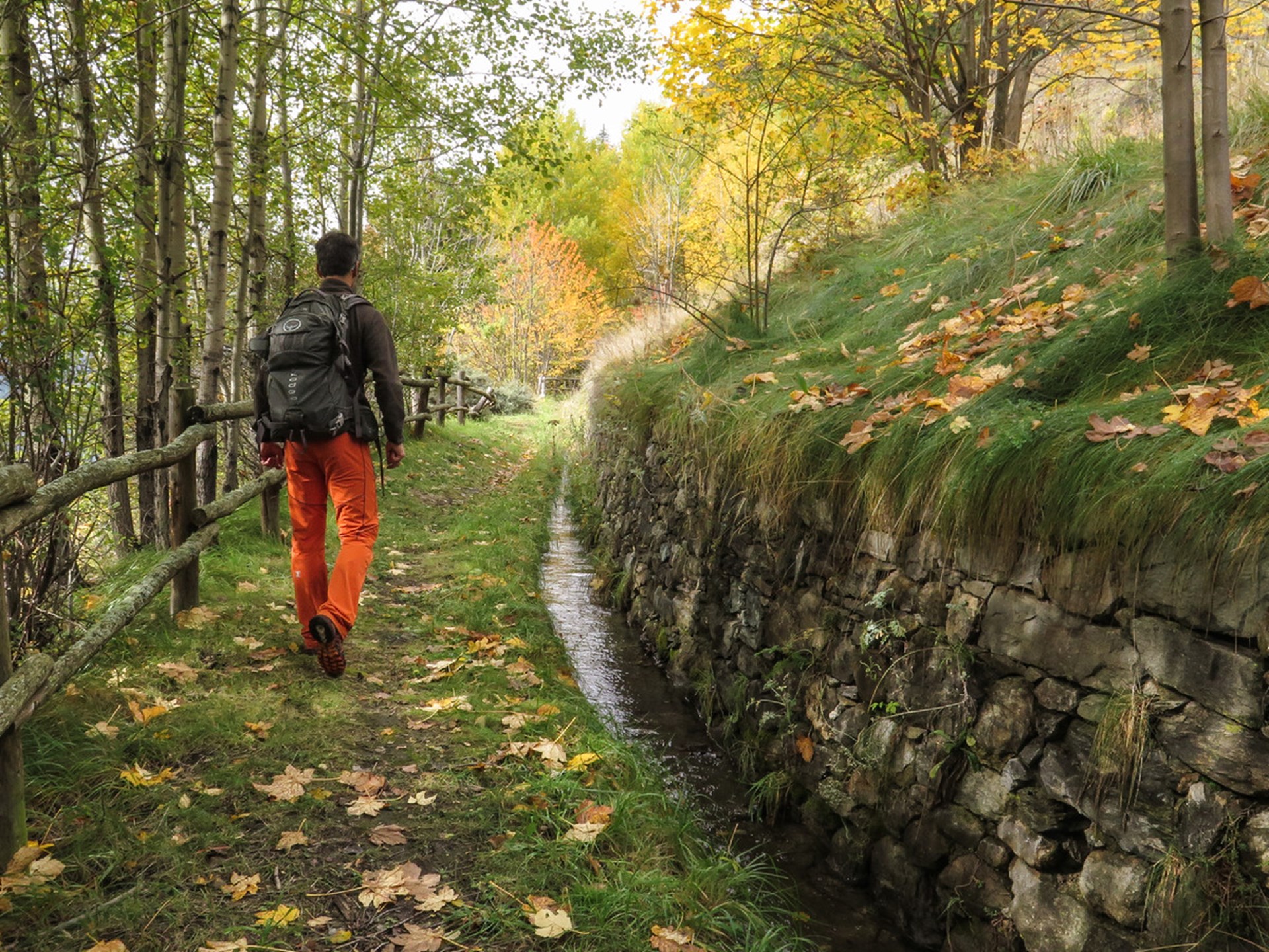 Continuez sur la route goudronnée qui passe derrière les maisons puis, en terre et avec des virages, monte jusqu’au bassin d’eau (suivez les indications du “ru”). De là commence le chemin qui longe la «ru».