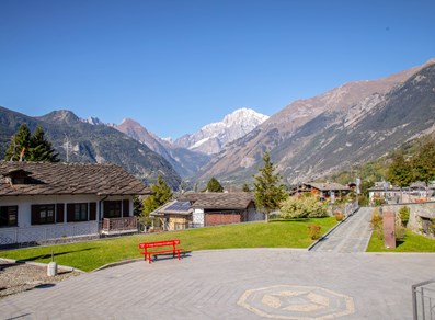 En partant du cimetière de La Salle, on entre dans le chef-lieu par la Via Cesare Ollietti, qui mène à la Piazza San Cassiano. Après avoir longé l’ église paroissiale, on rejoint en quelques instants la place Cavalieri di Vittorio Veneto : la vue sur le mont Blanc est toujours émouvante.