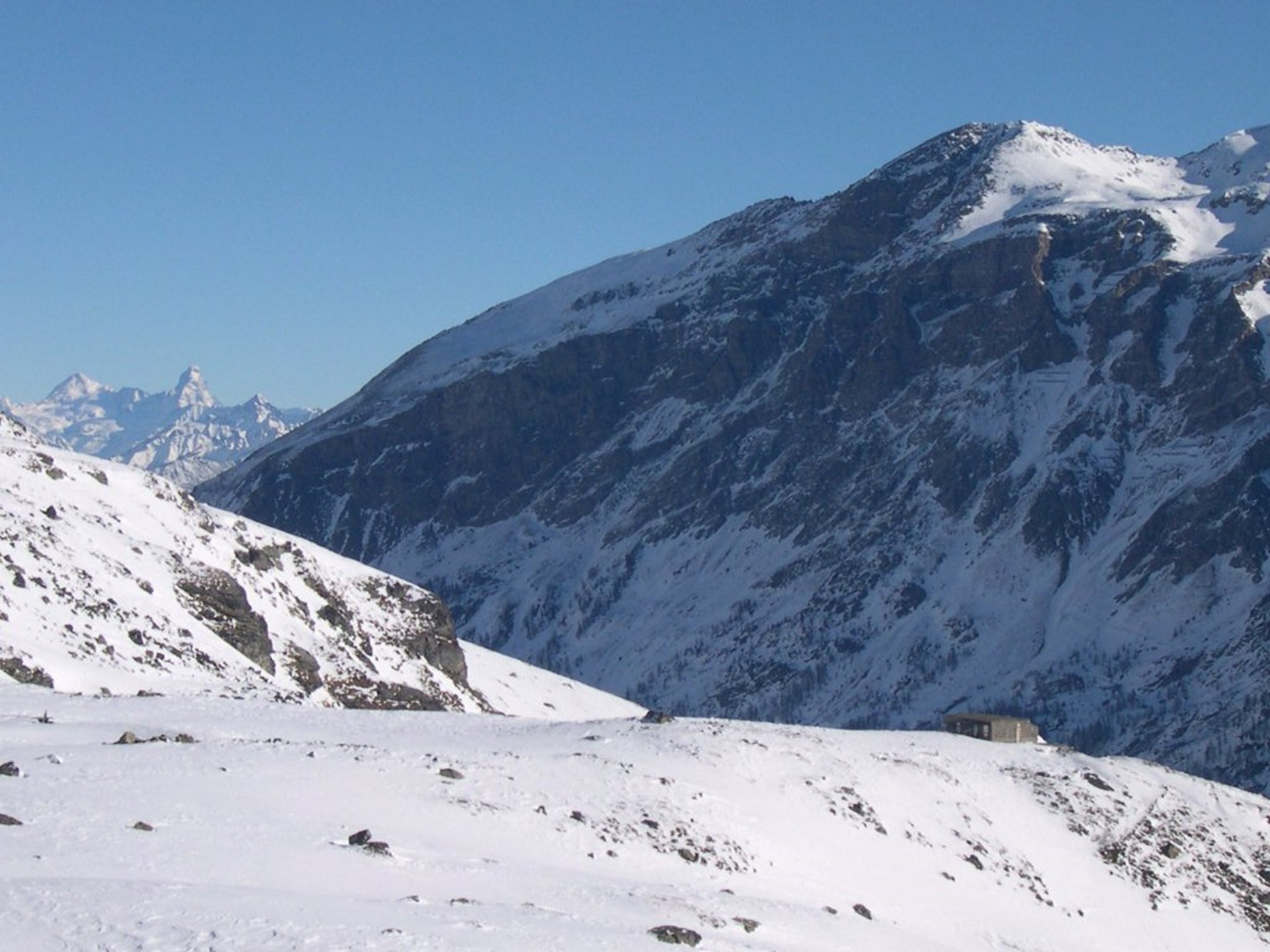 Maintenant continuer en suivant le tracé du sentier estival, remonter l’arête en allant vers la gauche jusqu’au sommet où vous apercevez les fermes de l’abri du Capitano Crova.