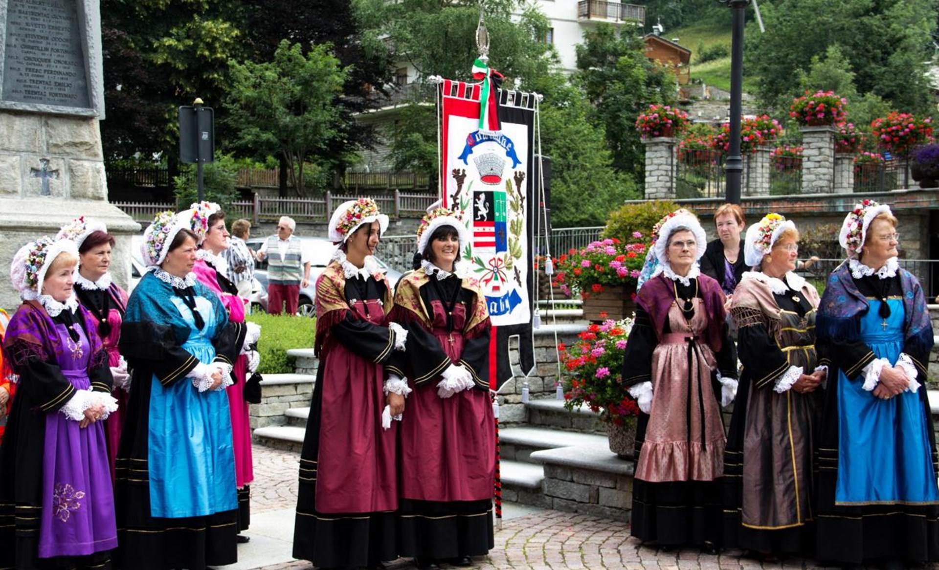 Il vestito è confezionato in panno nero (drap) ed è composto da una gonna stretta in vita, lunga fino alle caviglie (cotta) e da un corpino a maniche lunghe (coursèt), cuciti insieme. Sopra l’abito, il grembiule (foudèr) ravviva la tinta scura del vestito con la sua seta broccata o cangiante; viene cucito a pieghe strette, tenute insieme da un nastro di velluto che funge da cintura. Ad arricchire il costume, anche lo scialle (foular dè sià), di forma quadrata con lunghe frange, in seta assortita e coordinata al grembiule. L’elemento più originale del costume è senz’altro il copricapo (scuffia), formato da un’aureola di merletti e da un fondo di tulle bianco (moussouléina), incorniciato da una composizione di fiori e frutti nonché da un nastro di seta cangiante che ricade sul dorso. È usanza ornare il costume con alcuni gioielli: una croce e un cuoricino d’oro sospesi ad un nastro di velluto nero, delle collanine (djerètti) di perline, e delle spille d’oro utilizzate per fermare la pettorina del grembiule al corpino.