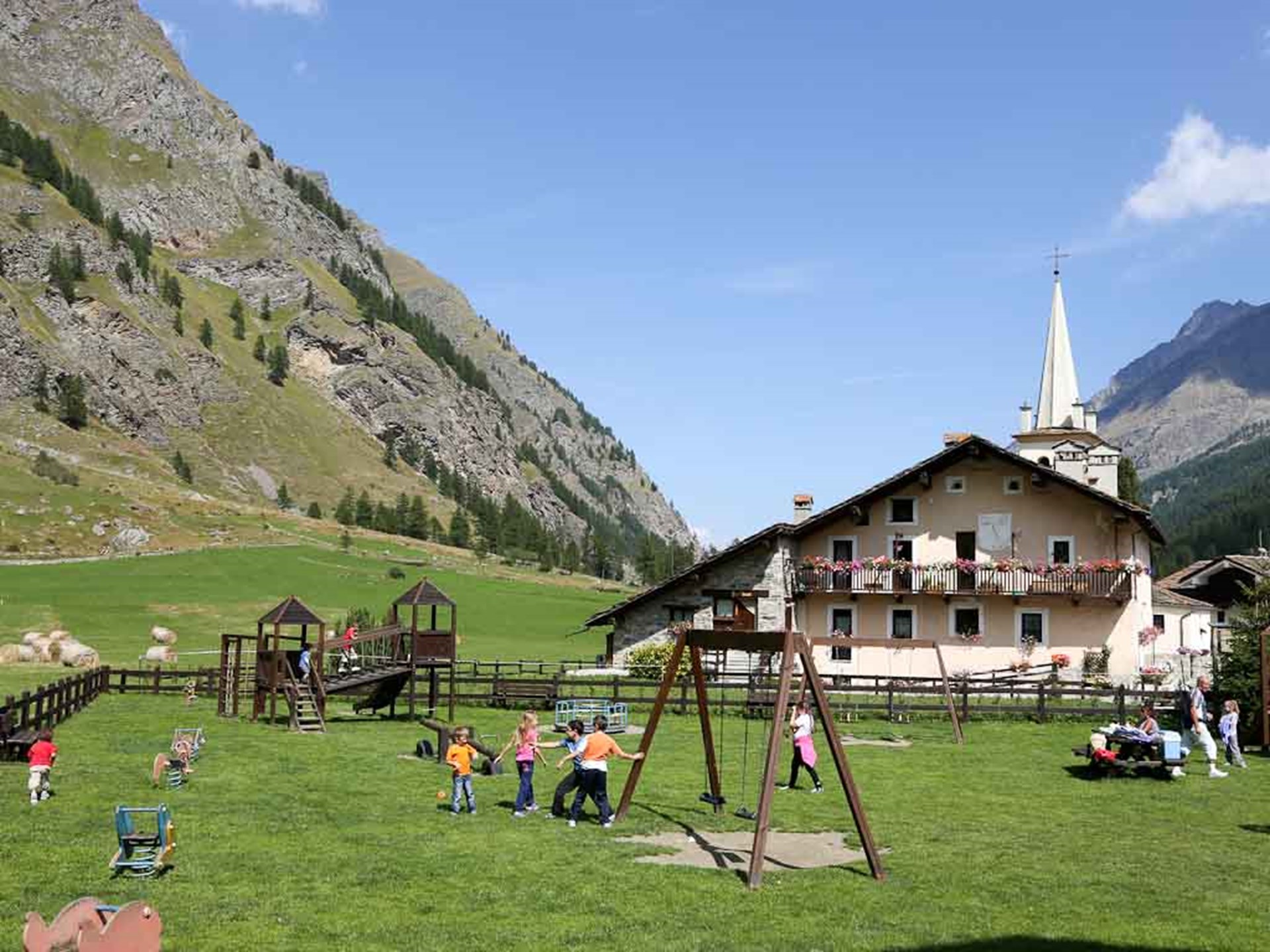 Zona verde calpestabile, strutture multigioco, scivoli, altalene, panchine, fontana con acqua potabile nelle vicinanze.