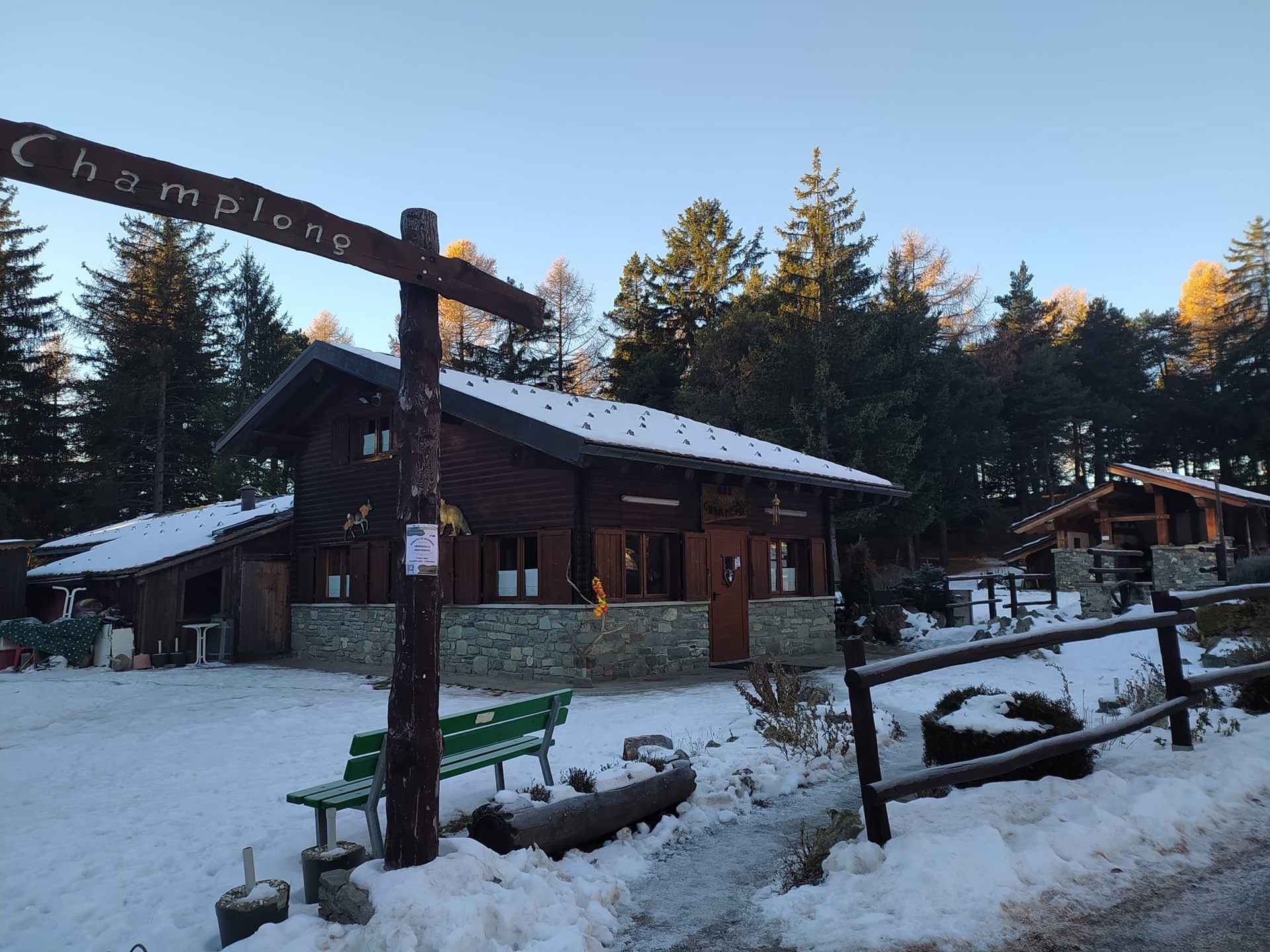 All’interno dell’area pic-nic di Champlong, si trova un grazioso chalet che ospita il bar ristorante. Il legno è protagonista: l’area infatti si trova immersa in un bellissimo bosco di abete rosso e larice e l’arredo del locale è arricchito da numerosi particolari che ne sfruttano e ne valorizzano la bellezza.
