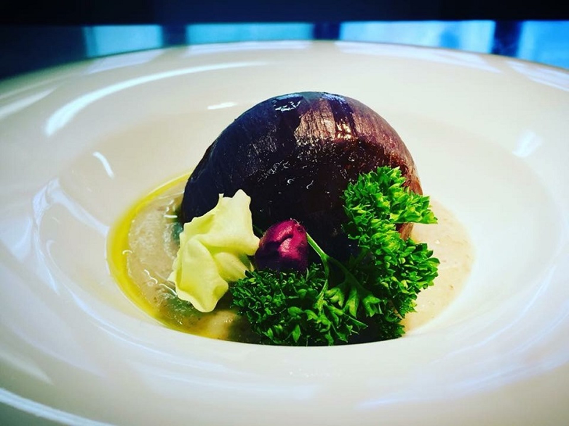- Cipolla rossa alla brace con Roquefort e crema di topinambur;