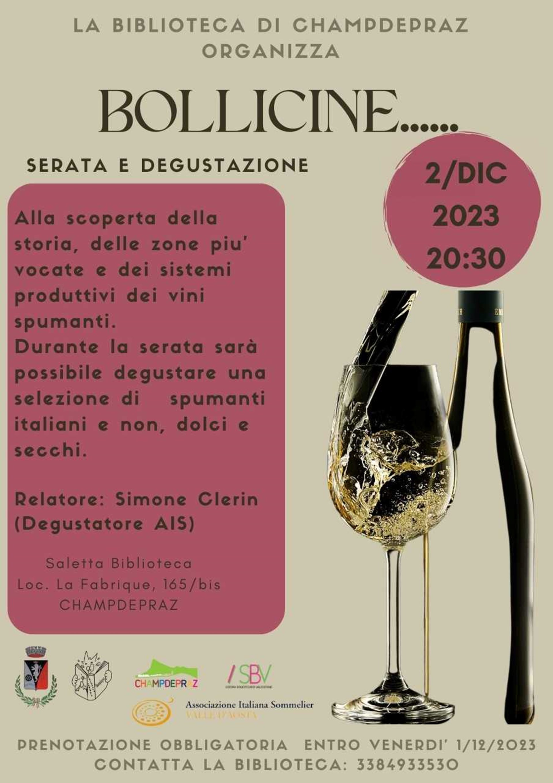 La Biblioteca organizza una serata per conoscere la storia, le zone piu' vocate e i sistemi produttivi dei vini spumanti. Durante la serata sarà possibile degustare una selezione di vini spumanti nazionali e non, dolci e secchi. Relatore Simone Clerin (Degustatore AIS).