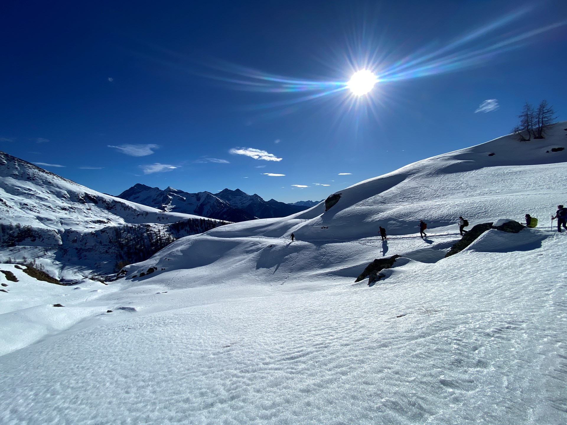Escursione con ciaspole con guida escursionistica alla scoperta della conca di Palasinaz in cui è stato ambientato parte del libro e film “Le Otto Montagne"