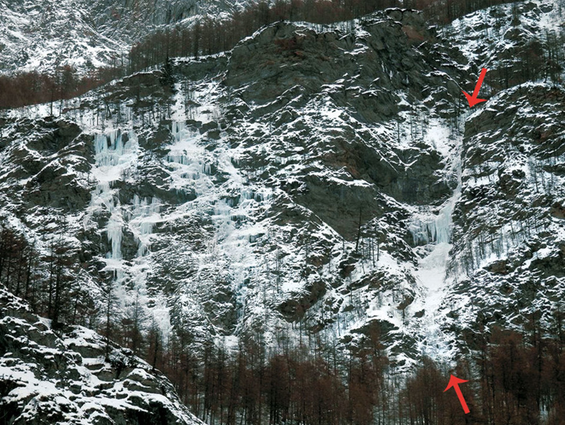L1: ghiaccio sovente fine ma mai verticale fino al canale nevoso superiore. Sosta su roccia a sinistra (fix).