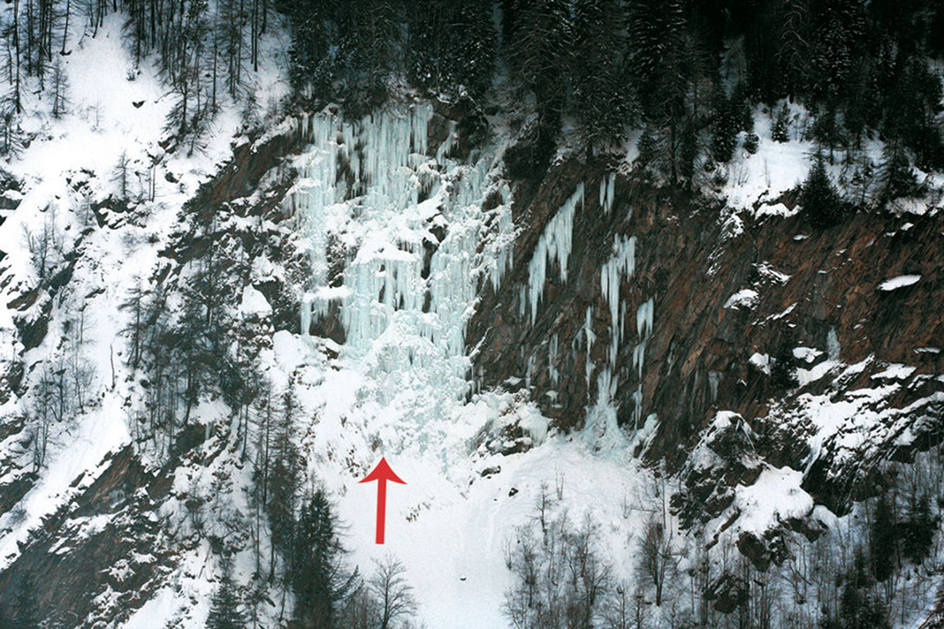 Si sale in due tiri da 40 metri circa, sostando su ghiaccio a metà in corrispondenza di un cambio di pendenza. Il tiro più impegnativo è il secondo, che presenta una bella sezione verticale in uscita. Attenzione agli ultimi metri prima del bosco, in cui il ghiaccio sovente non consolida perfettamente. Sosta in cima su albero.