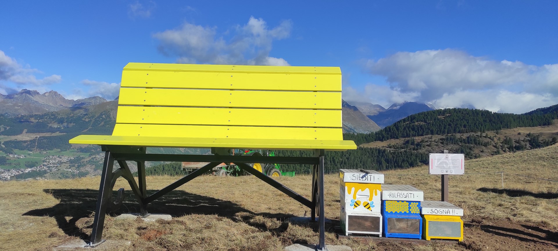 Sedersi sulla panchina regala la sensazione di tornare bambini di fronte alla grandezza delle Alpi. Davanti agli occhi si apre uno dei panorami più ampi e suggestivi della Valle d’Aosta: il Monte Zerbion, le Dame di Challand, il Barbeston, il Mont Emilius, la Becca di Nona, la Cima Longhede, la Becca d’Aver e, in lontananza, il maestoso Cervino.