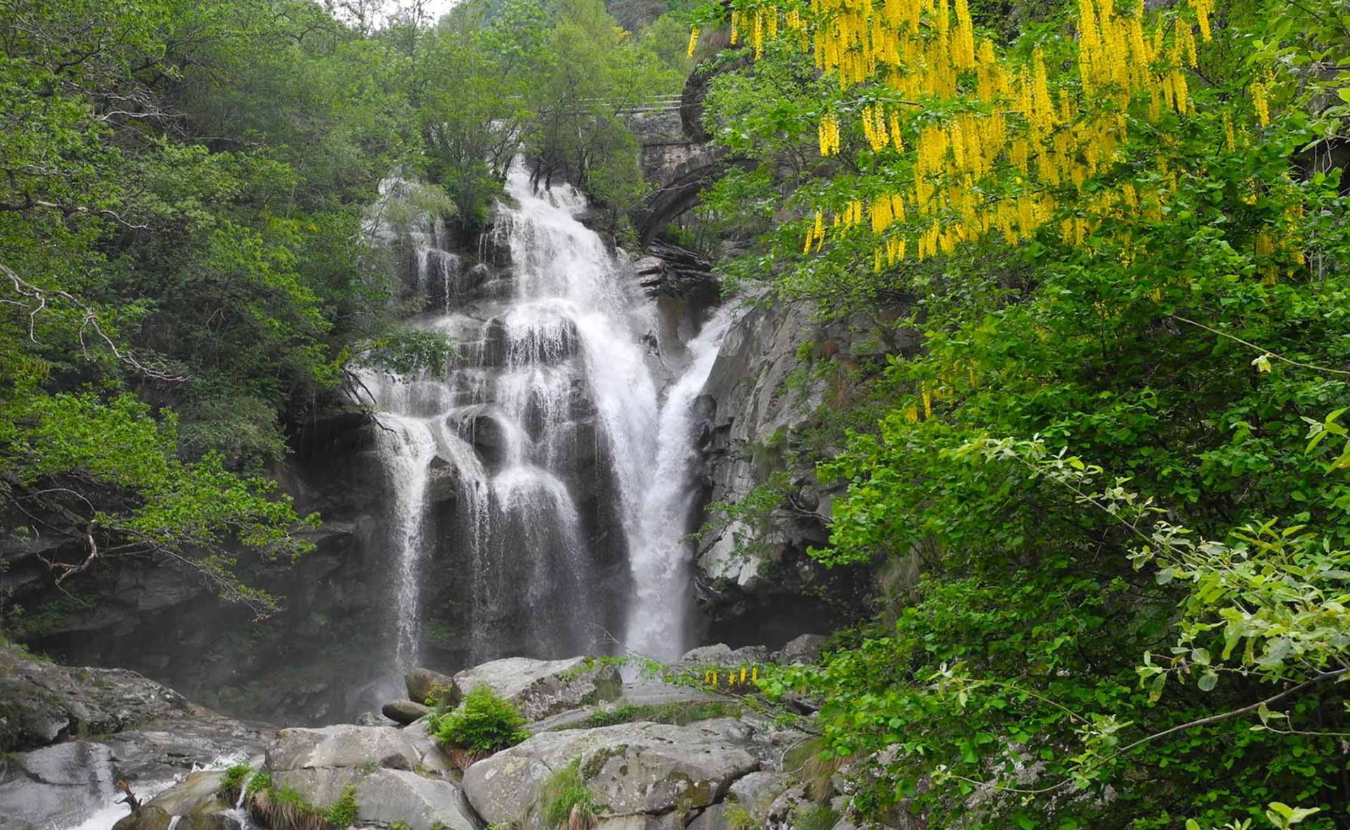 Stupenda in primavera ed inizio estate per il consistente volume della cascata dovuto allo scioglimento della neve e per la ricca fioritura del maggiociondolo.