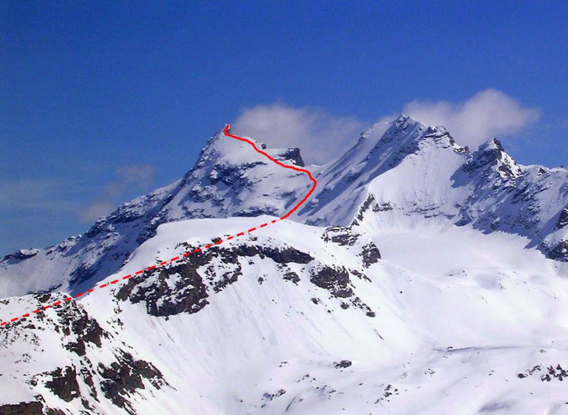 Dal bivacco si prosegue sulla morena che muore contro il ramo destro orografico del ghiacciaio d’Invergnan, quindi si continua in direzione sud est sul ghiacciaio stesso, ripido e talvolta crepacciato. Si costeggiano poi le rocce dello sperone nord ovest e si affronta il ripido pendio che porta al Colle della Grande Rousse. Dal valico, si volge a sinistra e si percorre la rocciosa cresta sud, che presenta in successione due salti (un passaggio di III grado) fino a pervenire con arrampicata non difficile sulla sommità settentrionale.