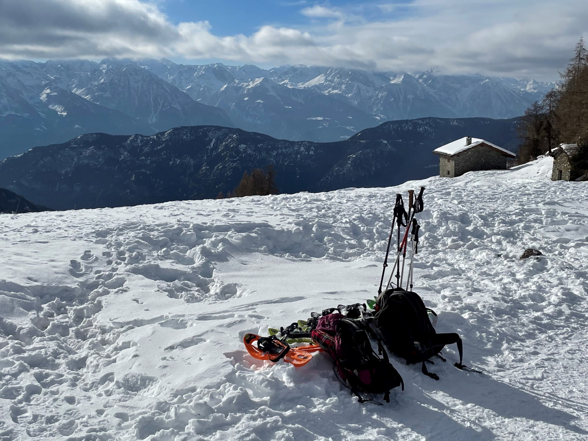 Da Vieu seguire la strada asfaltata sino ad incontrare il bivio per Chamois: trascurarlo e proseguire lungo la stradina, dopo un ampio tornante a sinistra, si raggiunge una barriera che indica l’inizio dell’itinerario con le racchette da neve. Risalire la strada che porta al Col Pilaz nell’abetaia che ogni tanto regala interessanti scorci sul Monte Zerbion e sul Mont Tantané. Superato un tratto di strada leggermente più ripido il tracciato prosegue in un tratto quasi rettilineo, siamo sullo spartiacque con il comune di Chamois ed ogni tanto, tra i rami degli abeti, si intravede l’inconfondibile sagoma del Cervino. Superato il punto di massima elevazione (2005 m) si inizia a scendere sino ad un bivio: si trascura la strada che prosegue diritta davanti a noi e si svolta a destra continuando la discesa sino al Col Pilaz (1975m). Iniziare la discesa, superare alcune baite caratteristiche, le lasciamo sulla nostra destra, e proseguire lungo la pista da fondo escursionistico. Dopo un primo tratto di discesa, la traccia si dirige verso il lago Croux, verso sinistra, che raggiungiamo senza vederlo. Lasciare a destra le baite presso il lago) e concludere la discesa imboccando la pista poderale: dopo un primo bivio, nel quale si svolta a destra, si compie un lungo traverso che raggiunge un alpeggio ed un secondo bivio: qui si svolta a sinistra. L’itinerario è giunto ormai alla fine, sotto si vedono già gli impianti di risalita e la chiesetta di La Magdeleine; dopo due tornanti si raggiunge il termine della strada con il divieto d’accesso e la fine della neve. Da qui si raggiungono le case di Artaz ed infine il punto di partenza concludendo l’anello.