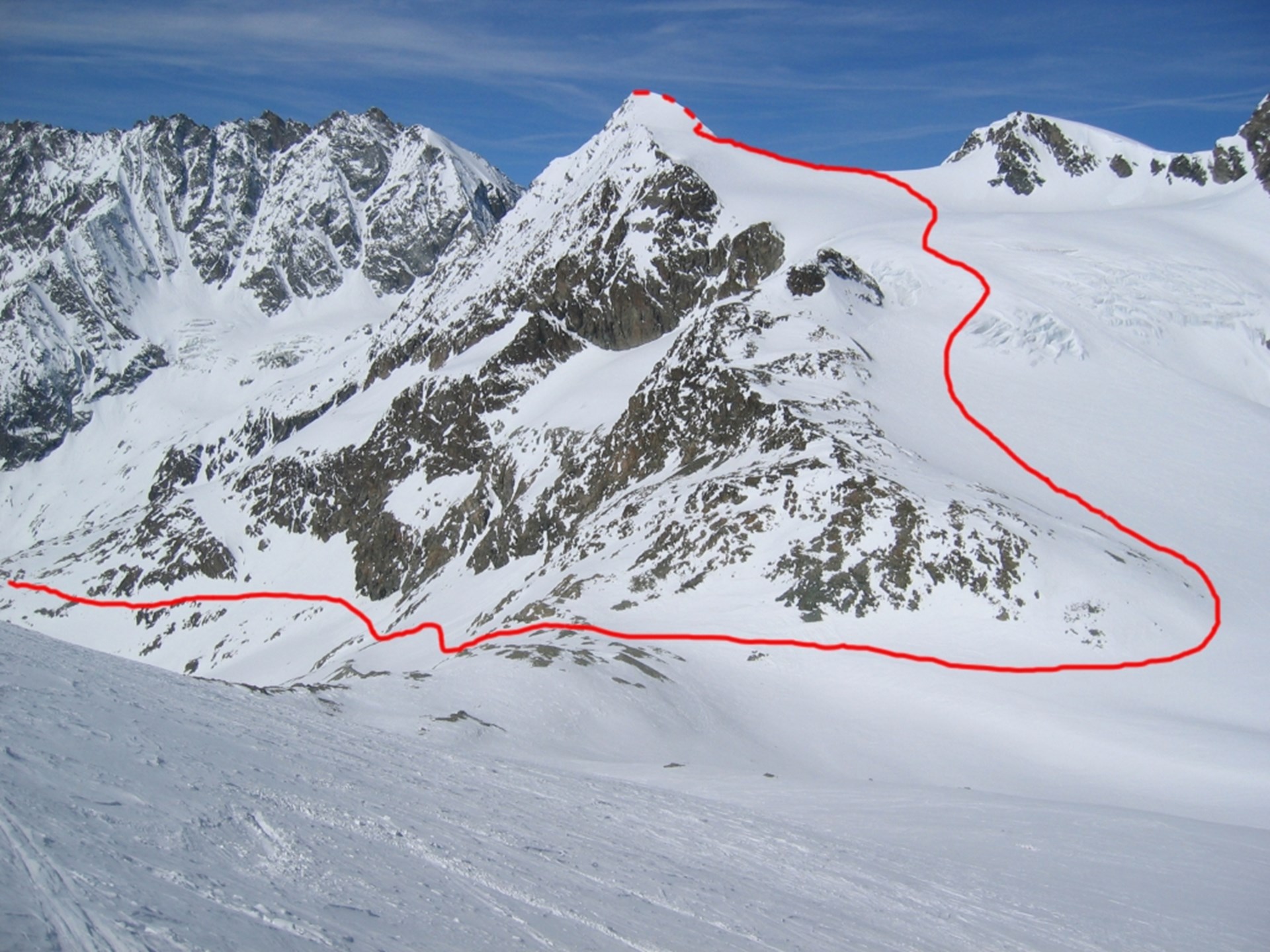 Proseguire per qualche minuto in piano quindi svoltare nettamente sulla sinistra tenendosi sulla sinistra del ghiacciaio d’Arolla. Aggirare piccoli crepaci puntando l’evidente Col d’Eveque 3392 m. Svoltare ancora a sinistra e seguendo la dorsale e successivamente la cresta portarsi alla vetta 3525 m. Gli ultimi metri vanno affrontati a piedi e con i ramponi.